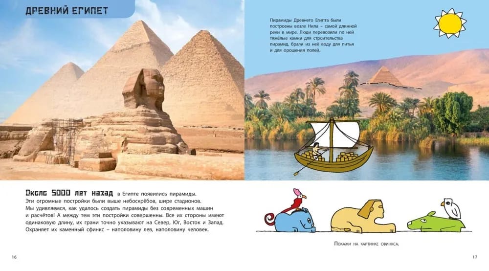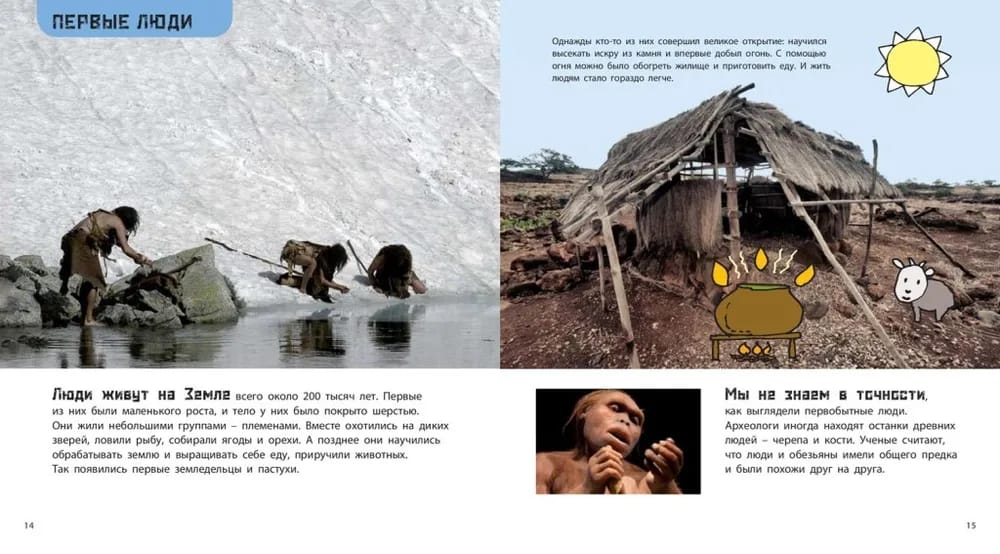 Эта книга с великолепными фотографиями и веселыми авторскими рисунками представляет собой краткий экскурс в историю человеческой цивилизации. Маленький читатель узнает, что появлению человека на Земле предшествовали миллионы лет, в течение которых на безжизненной планете появились первые живые существа, которые впоследствии развились в самые разные формы. А всего за 200 тысяч лет человечество прошло огромный путь от первобытного состояния до появления первых космических кораблей. Каждая веха развития человечества - от первобытных людей до первых земледельцев, от Средневековья до эпохи географических открытий, от первых автомобилей до современных компьютеров - представлена кратко и наглядно, а забавные вопросы к читателю на каждом развороте позволят ребенку лучше запомнить материал.