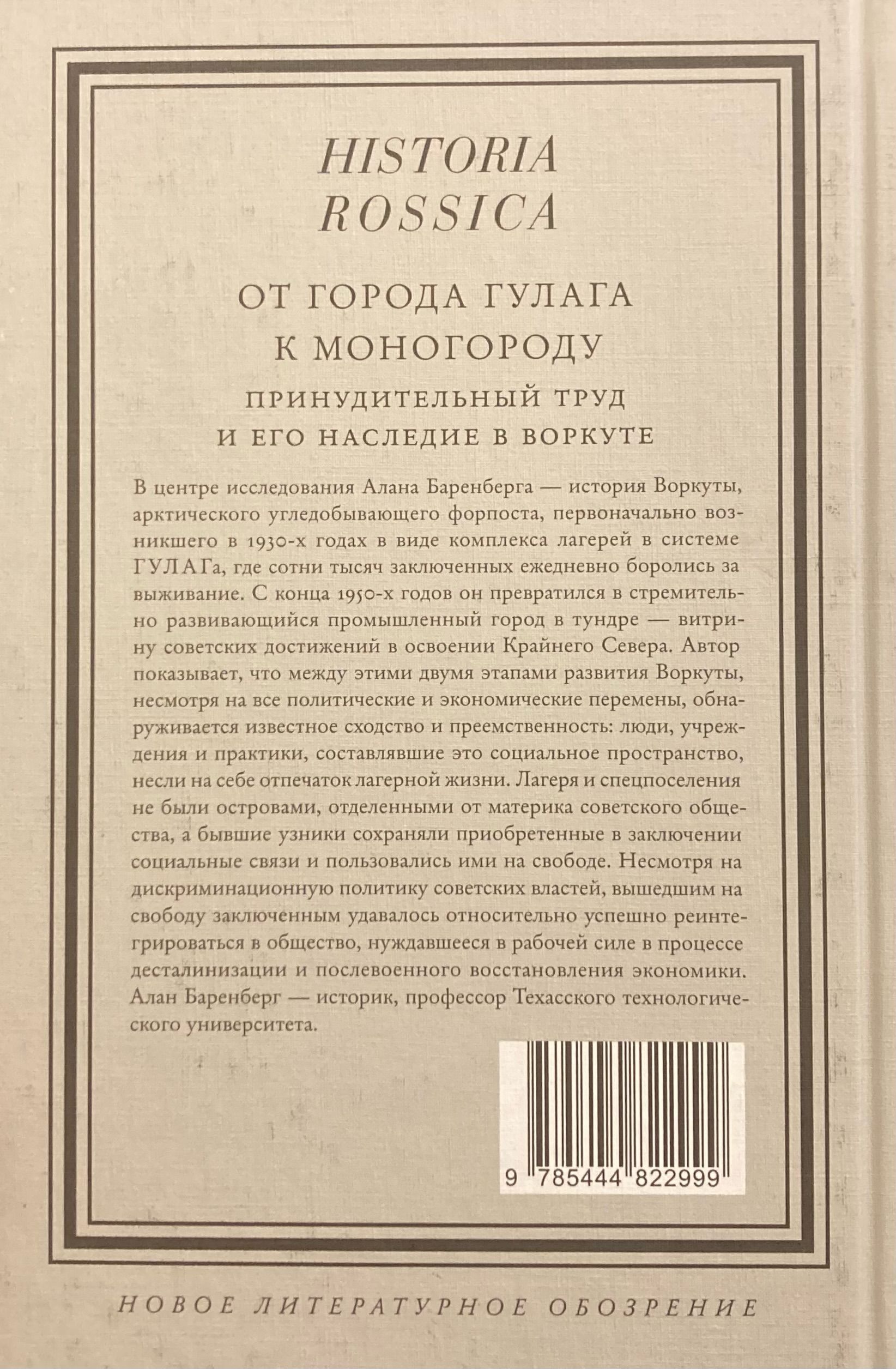 В центре исследования Алана Баренберга — история Воркуты, арктического угледобывающего форпоста, первоначально возникшего в 1930 х годах в виде комплекса лагерей в системе ГУЛАГа, где сотни тысяч заключенных ежедневно боролись за выживание. С конца 1950 х годов он превратился в стремительно развивающийся промышленный город в тундре — витрину советских достижений в освоении Крайнего Севера. Автор показывает, что между этими двумя этапами развития Воркуты, несмотря на все политические и экономические перемены, обнаруживается известное сходство и преемственность: люди, учреждения и практики, составлявшие это социальное пространство, несли на себе отпечаток лагерной жизни. Лагеря и спецпоселения не были островами, отделенными от материка советского общества, а бывшие узники сохраняли приобретенные в заключении социальные связи и пользовались ими на свободе. Несмотря на дискриминационную политику советских властей, вышедшим на свободу заключенным удавалось относительно успешно реинтегрироваться в общество, нуждавшееся в рабочей силе в процессе десталинизации и послевоенного восстановления экономики. Алан Баренберг — историк, профессор Техасского технологического университета.