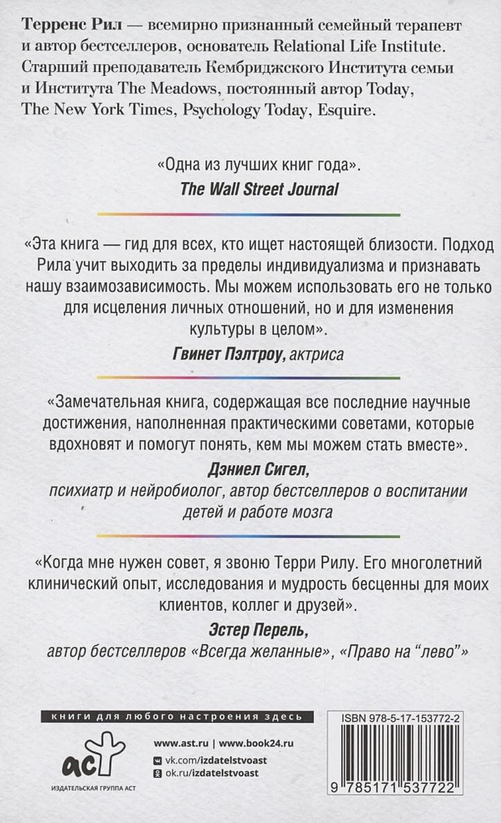 Как научиться более мудрому взаимодействию без доминирования и желания победить? Как строить отношения более экологичным способом? Всемирно известный психотерапевт Терренс Рил более 25 лет работает с парами. Его метод, основанный на новейших достижениях психологии, психотерапии и нейробиологии, перевернет ваши представления о личностном росте, близости и современном мире. Вы сможете разобраться, почему именно начинаете реагировать и действовать незрело, и что необходимо, чтобы построить здоровые близкие отношения. Книгу можно рекомендовать всем, кто сталкивается с трудностями в отношениях, переживает семейный кризис, часто ссорится со своим партнером, хочет улучшить качество взаимоотношений. Кроме того, книга представляет интерес для психологов, психотерапевтов, семейных консультантов, социальных работников.