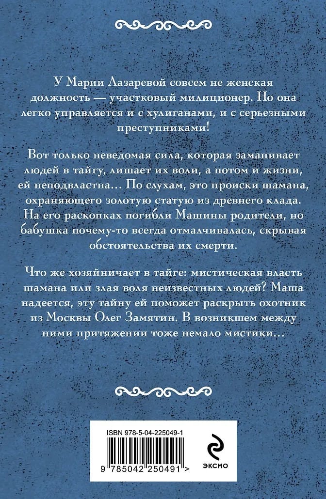 У Марии Лазаревой совсем не женская должность — участковый милиционер. Но она легко управляется и с хулиганами, и с серьезными преступниками! Вот только неведомая сила, которая заманивает людей в тайгу, лишает их воли, а потом и жизни, ей неподвластна… По слухам, это происки шамана, охраняющего золотую статую из древнего клада. На его раскопках погибли Машины родители, но бабушка почему-то всегда отмалчивалась, скрывая обстоятельства их смерти. Что же хозяйничает в тайге: мистическая власть шамана или злая воля неизвестных людей? Маша надеется, эту тайну ей поможет раскрыть охотник из Москвы Олег Замятин. В возникшем между ними притяжении тоже немало мистики…