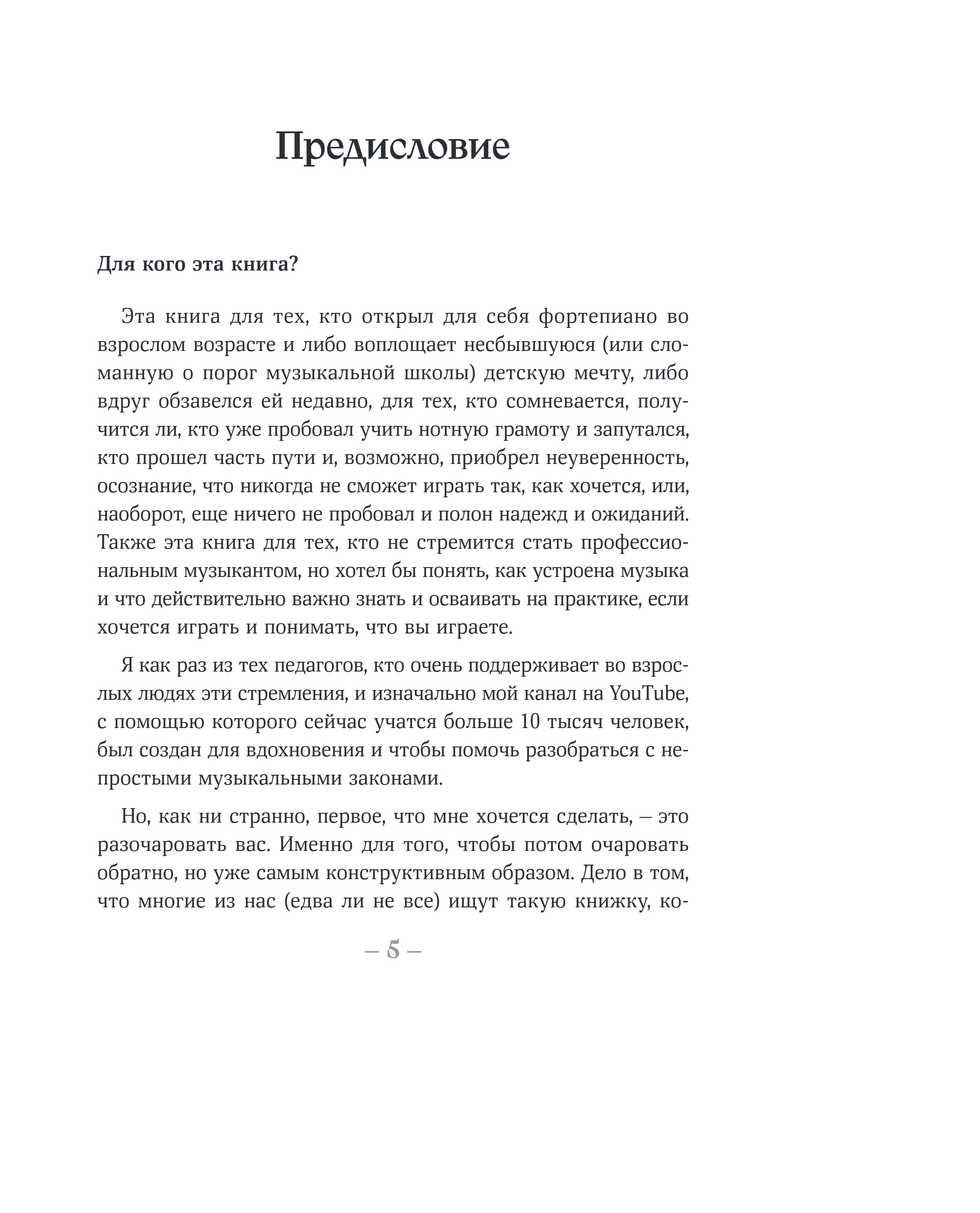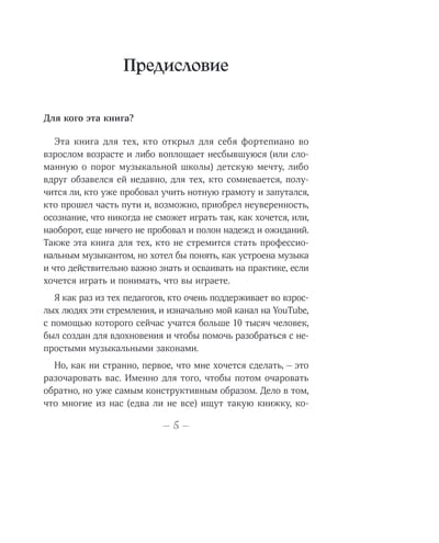 Если вы мечтаете играть на фортепиано, то знаете, как сложно может быть сделать первые шаги. Возможно, вы травмированы музыкальной школой или, наоборот, начинаете с нуля и чувствуете растерянность. Обучение музыкальному инструменту — задача не из простых, и поэтому так важно найти наставника, который поможет преодолеть сомнения и покажет, в каком направлении двигаться. Таким наставником может стать эта книга, которая пройдет вместе с вами путь от начинающего до уверенного музыканта.
