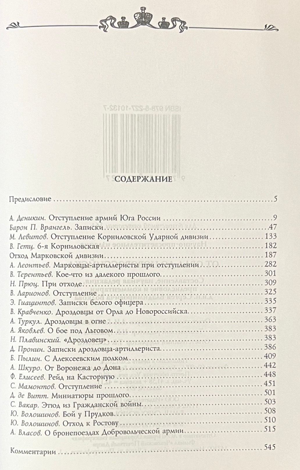 Вооруженные силы белых оказались расчлененными, они стали нести значительные потери и быстро таяли. В ходе отступления потери белых убитыми, умершими и попавшими в плен составили более 200 тыс. человек. Большинство публикуемых воспоминаний в России никогда не издавались. Книга снабжена обширными и впервые публикуемыми комментариями, содержащими несколько сот неизвестных биографических справок об авторах и героях очерков.