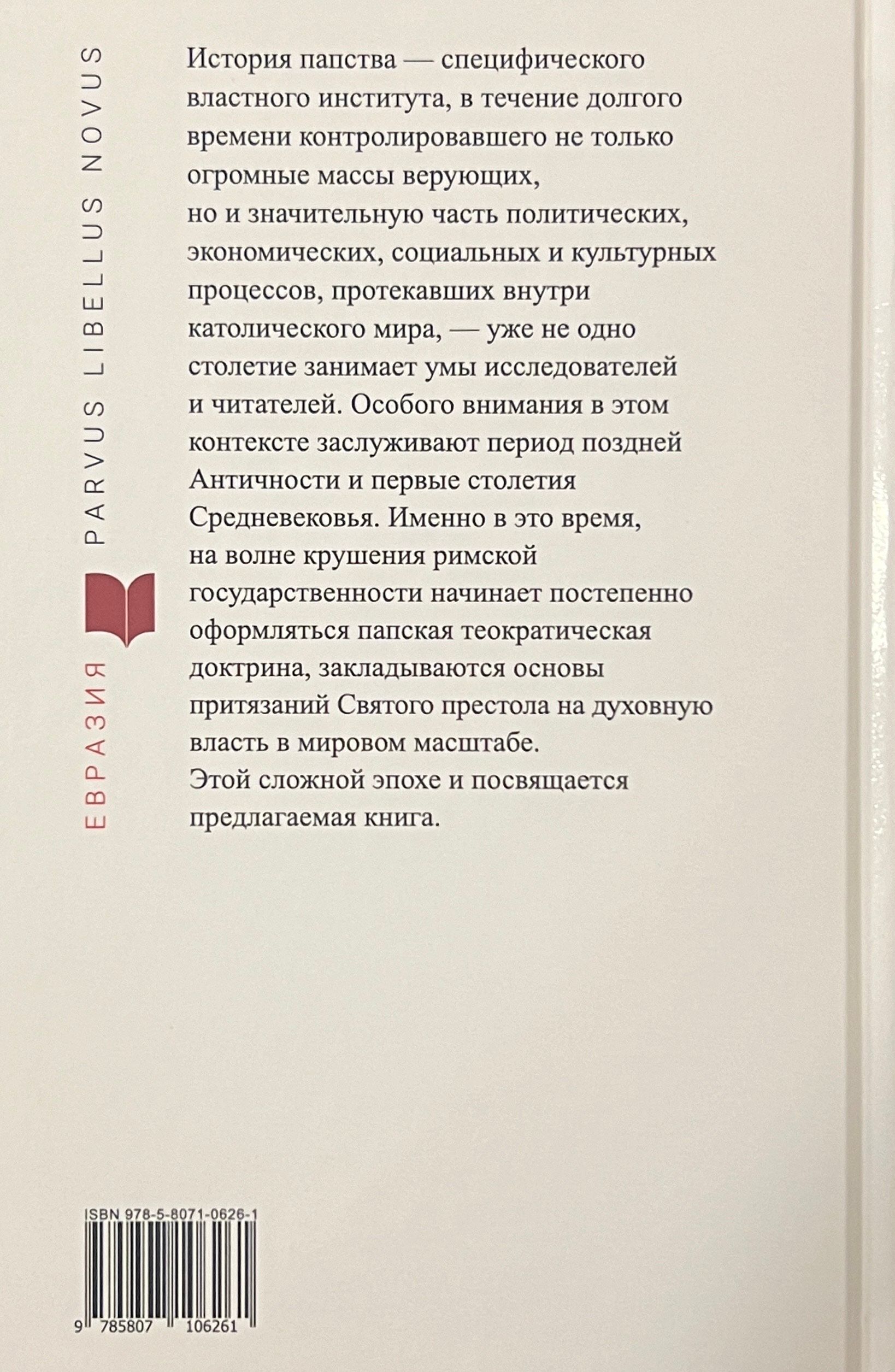 История папства — специфического властного института, в течение долгого времени контролировавшего не только огромные массы верующих, но и значительную часть политических, экономических, социальных и культурных процессов, протекавших внутри католического мира, — уже не одно столетие занимает умы исследователей и читателей. Особого внимания в этом контексте заслуживают период поздней Античности и первые столетия Средневековья. Именно в это время, на волне крушения римской государственности начинает постепенно оформляться папская теократическая доктрина, закладываются основы притязаний Святого престола на духовную власть в мировом масштабе. Этой сложной эпохе и посвящается предлагаемая книга.