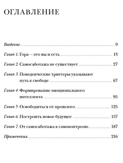 Центральная тема книги — самосаботаж. Почему мы поддаемся ему и мешаем себе жить, препятствуя собственным же попыткам измениться и сделать свою жизнь лучше? С точки зрения автора, самосаботаж — это механизм психологической защиты. Он возникает по разным причинам: из-за конфликта внутренних интересов, из-за страха перед неизвестностью, из-за негативных ассоциаций и личных убеждений. Однако нам под силу с ним справиться: автор предлагает ряд эффективных приемов, которые помогут изменить жизнь к лучшему.