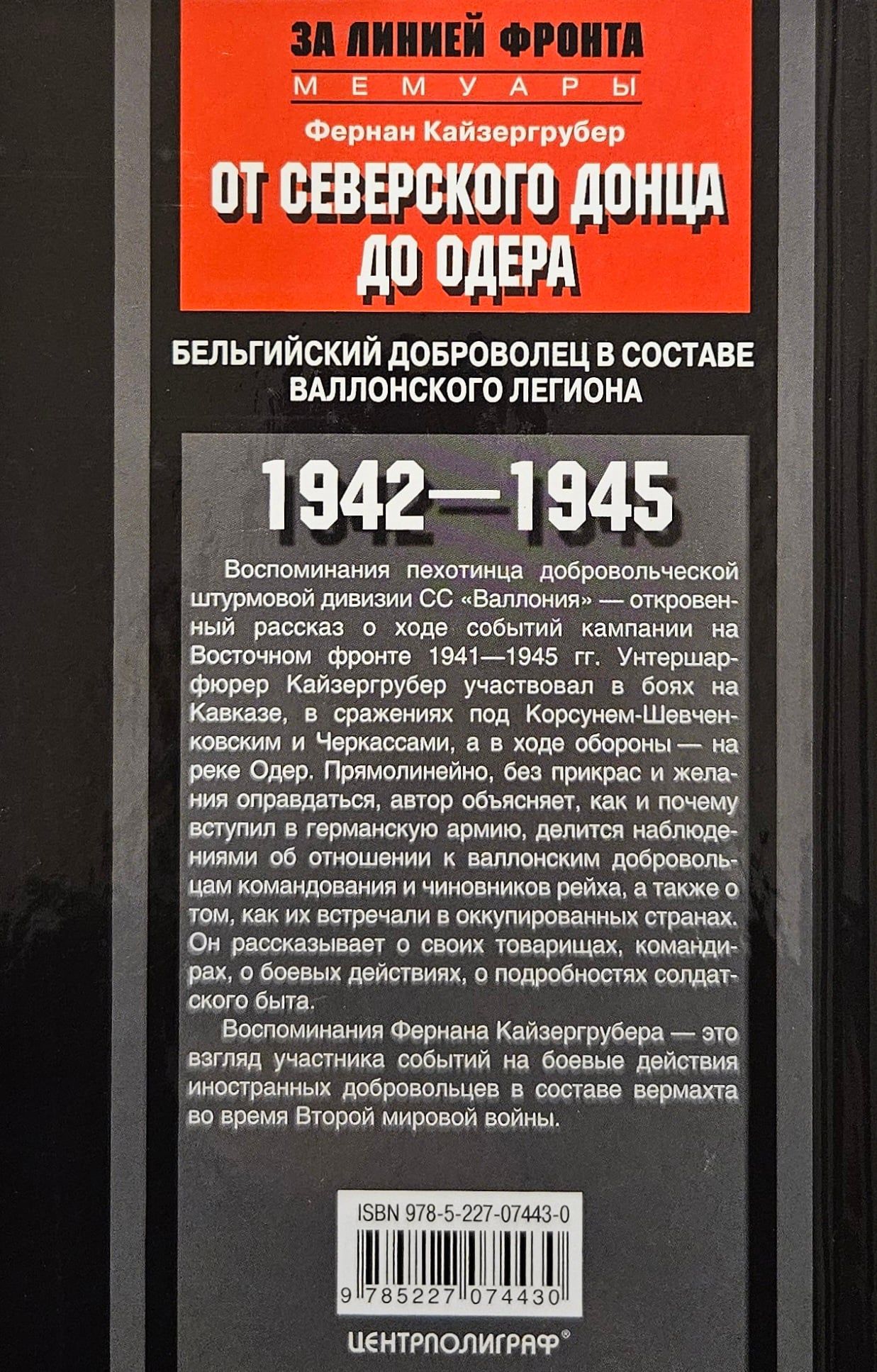 Воспоминания пехотинца добровольческой штурмовой дивизии СС «Валлония» — откровенный рассказ о ходе событий кампании на Восточном фронте 1941—1945 гг. Унтершарфюрер Кайзергрубер участвовал в боях на Кавказе, в сражениях под Корсунем-¬Шевченковским и Черкассами, а в ходе обороны — на реке Одер. Прямолинейно, без прикрас и желания оправдаться, автор объясняет, как и почему вступил в германскую армию, делится наблюдениями об отношении к валлонским добровольцам командования и чиновников рейха, а также о том, как их встречали в оккупированных странах. Он рассказывает о своих товарищах, командирах, о боевых действиях, о подробностях солдатского быта. Воспоминания Фернана Кайзергрубера — это взгляд участника событий на боевые действия иностранных добровольцев в составе вермахта во время Второй мировой войны.