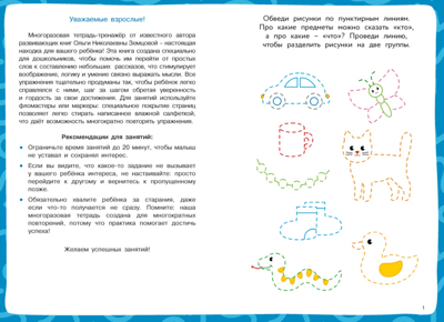 Многоразовая тетрадь разработана известным педагогом и автором развивающих пособий О. Н. Земцовой специально для того, чтобы сделать процесс обучения дошкольников по-настоящему интересным и удобным.