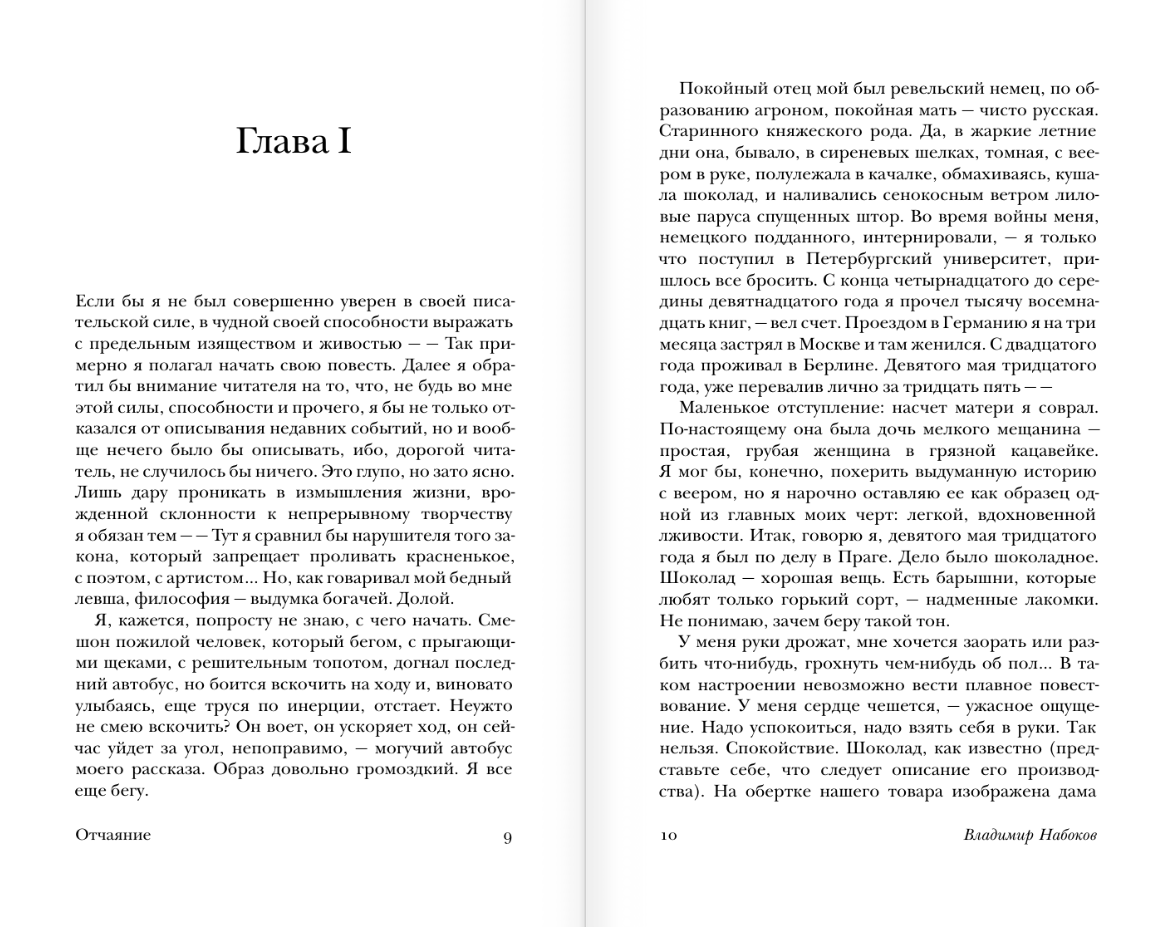 Форма повествования от первого лица, вера героя-рассказчика в собственную исключительность и блистательный слог сближают «‎Отчаяние»‎ с написанной двадцать лет спустя «‎Лолитой»‎.