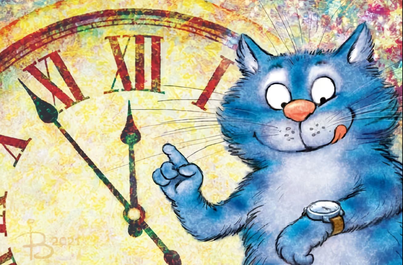 Открытка. Синие коты. Новогодние часы