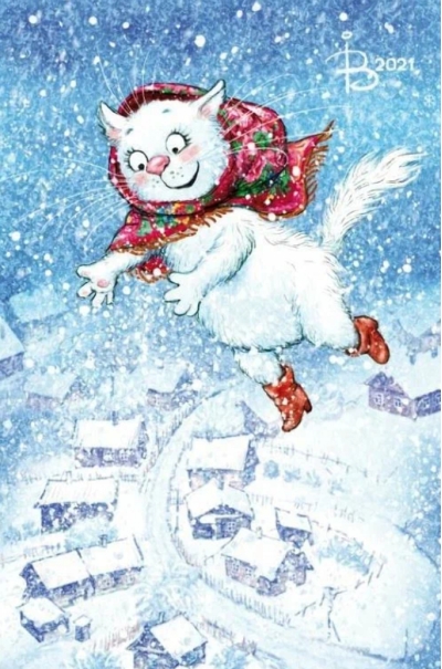Красивая и забавная почтовая открытка с синими котами обязательно понравится получателю, поскольку рисунки Ирины Зенюк очень милые и продуманы до мелочей.