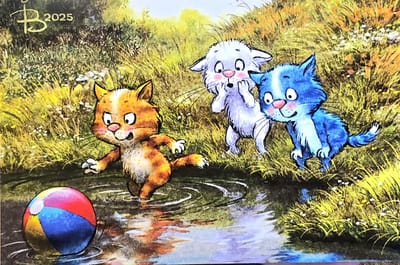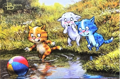Открытка. Синие коты. Уронили в речку мяч