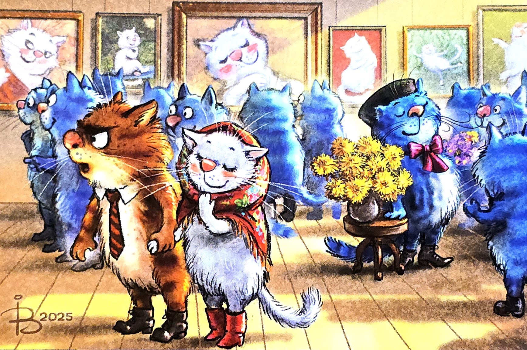 Красивая и забавная почтовая открытка с синими котами обязательно понравится получателю, поскольку рисунки Ирины Зенюк очень милые и продуманы до мелочей.
