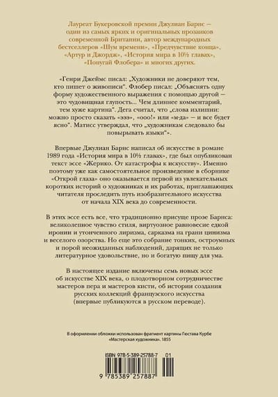Своим первым опытом в жанре эссе об искусстве Джулиан Барнс называет главу нашумевшего романа-антиутопии «История мира в 10½ главах» (1989), посвященную картине Теодора Жерико «Плот „Медузы“». Именно поэтому, уже как самостоятельное произведение, в сборнике «Открой глаза» она оказывается первой из увлекательных коротких историй о художниках и их работах, приглашающих читателя проследить путь изобразительного искусства от начала XIX века до современности.