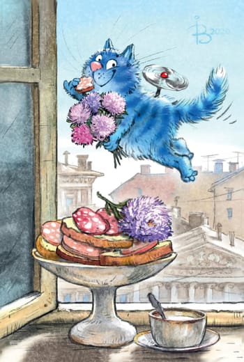 Красивая и забавная почтовая открытка с синими котами обязательно понравится получателю, поскольку рисунки Ирины Зенюк очень милые и продуманы до мелочей.