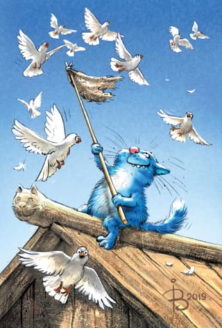 Красивая и забавная почтовая открытка с синими котами обязательно понравится получателю, поскольку рисунки Ирины Зенюк очень милые и продуманы до мелочей.