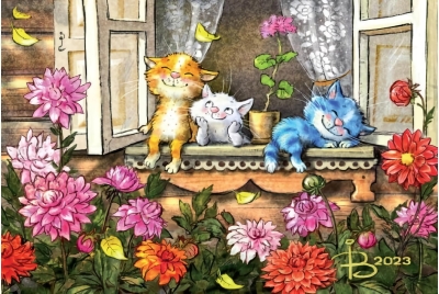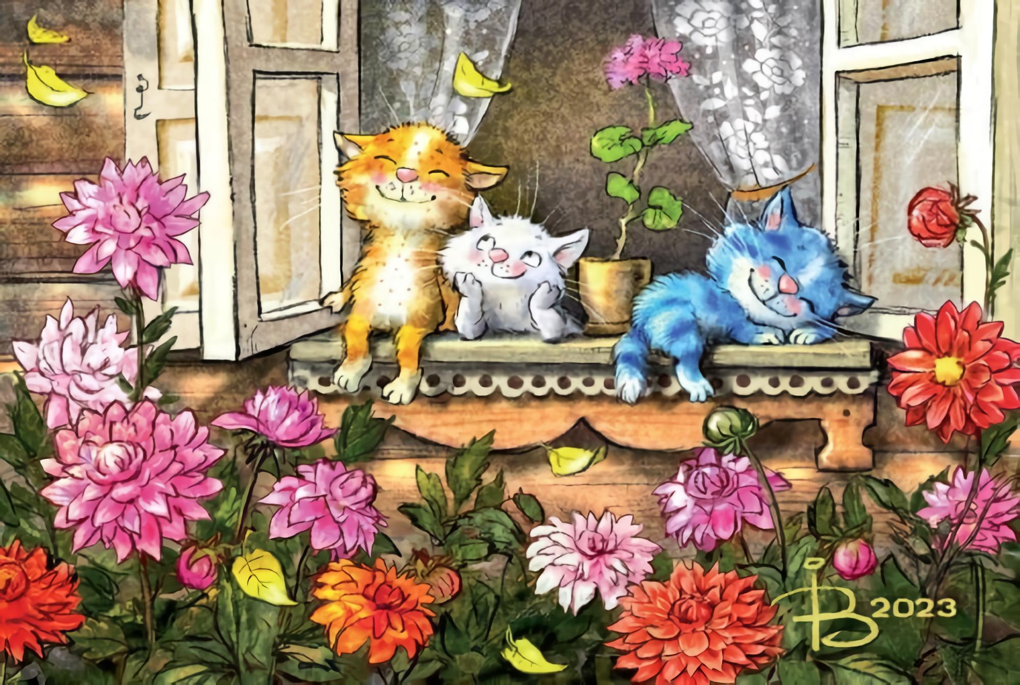 Открытка. Синие коты. Котята на подоконнике