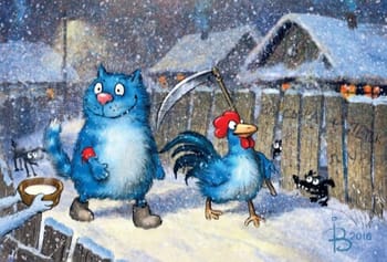 Красивая и забавная почтовая открытка с синими котами обязательно понравится получателю, поскольку рисунки Ирины Зенюк очень милые и продуманы до мелочей.