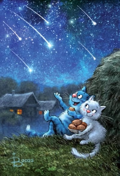 Красивая и забавная почтовая открытка с синими котами обязательно понравится получателю, поскольку рисунки Ирины Зенюк очень милые и продуманы до мелочей.