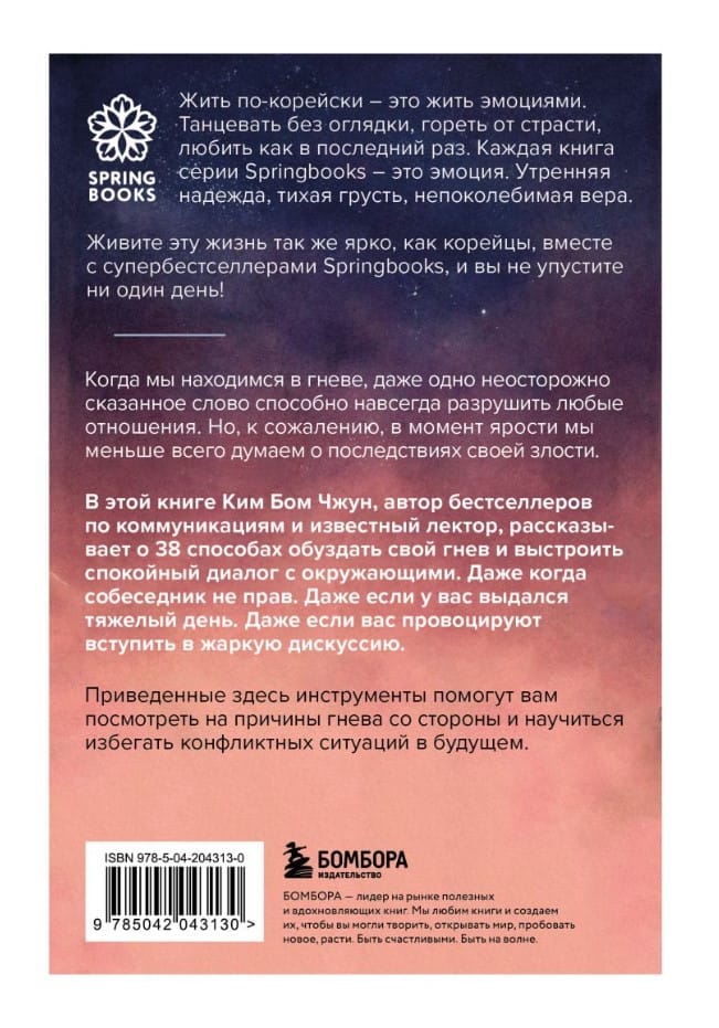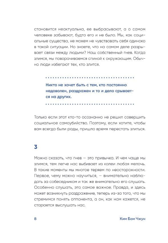 Ким Бом Чжун считает, что гнев играет ключевую роль в разрушении отношений между людьми. Когда мы злимся, то плохо не только нам, но и нашему собеседнику, вследствие чего возникает конфликт, и люди отдаляются друг от друга. В жизни возникает бесчисленное количество ситуаций, которые могут вывести нас из себя, но правильно ли мы на них реагируем? Всегда ли стоит злиться? Действительно бывают, моменты, которые будто запускают механизм-взрывчатку внутри тебя. Кем-то неосторожно сказанное слово, и вот ты уже весь красный от злости высказываешь очередную тираду собеседнику. Или в иной ситуации выслушиваешь гневную речь от собеседника. Поэтому автор дает советы для обеих сторон конфликта. В книге 5 глав, посвященных тому, как думать, говорить, слушать и даже молчать.