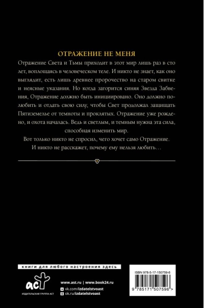 Отражение Света и Тьмы приходит в этот мир лишь раз в сто лет, воплощаясь в человеческом теле. И никто не знает, как оно выглядит, есть лишь древнее пророчество на старом свитке и неясные указания. Но когда загорится синяя Звезда Забвения, Отражение должно быть инициировано. Оно должно полюбить и отдать свою силу, чтобы Свет продолжал защищать Пятиземелье от темноты и проклятых. Отражение уже рождено, и охота началась. Ведь и светлым, и темным нужна эта сила, способная изменить мир. Вот только никто не спросил, чего хочет само Отражение. И никто не расскажет, почему ему нельзя любить...