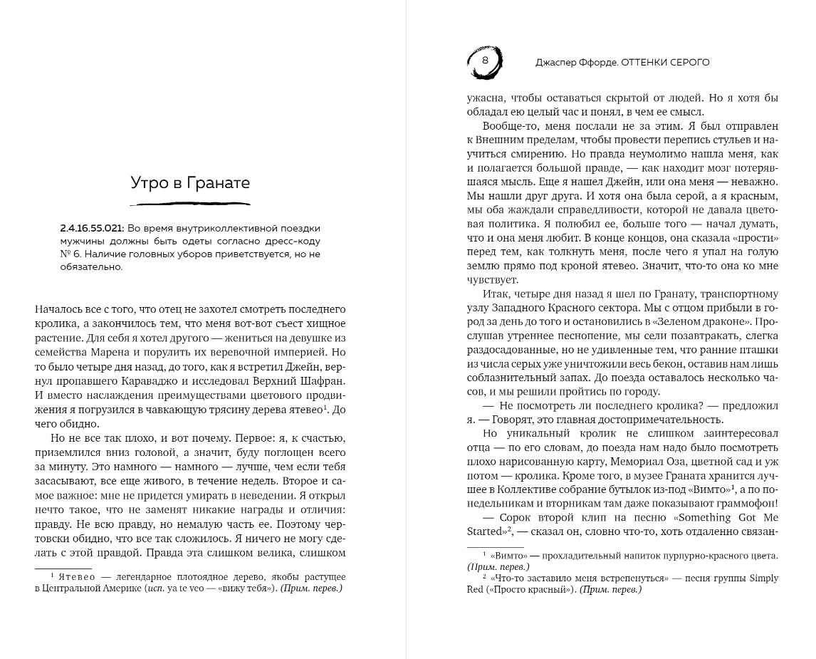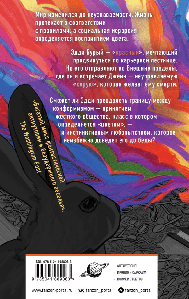 Молодой Эдди Бурый не стремится быть кем-то иным, кроме как верным трутнем Коллектива. С его более тонким восприятием красного цвета он вполне может жениться на Констанс Марена и унаследовать завод ее семейства. Возможно, у него даже хватит красного восприятия, чтобы занять должность перфекта. Для Эдди жизнь выглядит красочно. Жизнь выглядит хорошо. Но все меняется, когда он вместе с отцом, уважаемым цветоподборщиком, переезжает в Восточный Кармин. Там он влюбляется в «серую» по имени Джейн, которая открывает ему глаза на болезненную правду, скрываемую в кажущемся идеальным, но жестко контролируемом обществе. Любопытство — опасная черта, которую не стоит проявлять, — берет верх над Эдди, и он начинает задавать вопросы. Почему не хватает ложек? Что случилось с теми, кто не вернулся из Верхнего Шафрана? И почему, когда вы начинаете задаваться вопросом об окружающем мире, черно-белая определенность сводится к оттенкам серого?