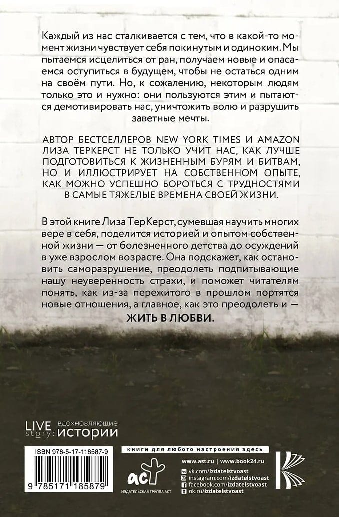 В этой книге Лиза ТерКерст, сумевшая научить многих вере в себя, поделится историей и опытом собственной жизни — от болезненного детства до осуждений в уже взрослом возрасте. Она подскажет, как остановить саморазрушение, преодолеть подпитывающие нашу неуверенность страхи и поможет читателям понять, как из-за пережитого в прошлом портятся новые отношения, а главное, как это преодолеть и – жить в любви.