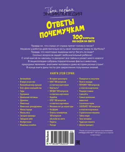 Правда ли, что страус от страха прячет голову в песок? Неужели у роботов действительно есть свой чемпионат мира по футболу? Правда, что некоторые ящерицы могут бегать по воде? Сколько вопросов задаёт любознательный ребёнок! С этой книгой он наконец-то раскроет все тайны и узнает много нового! В энциклопедии собраны поразительные факты о животных, природных явлениях, анатомии человека и даже истории разных стран! В конце книги даны тесты для закрепления полученных знаний.
