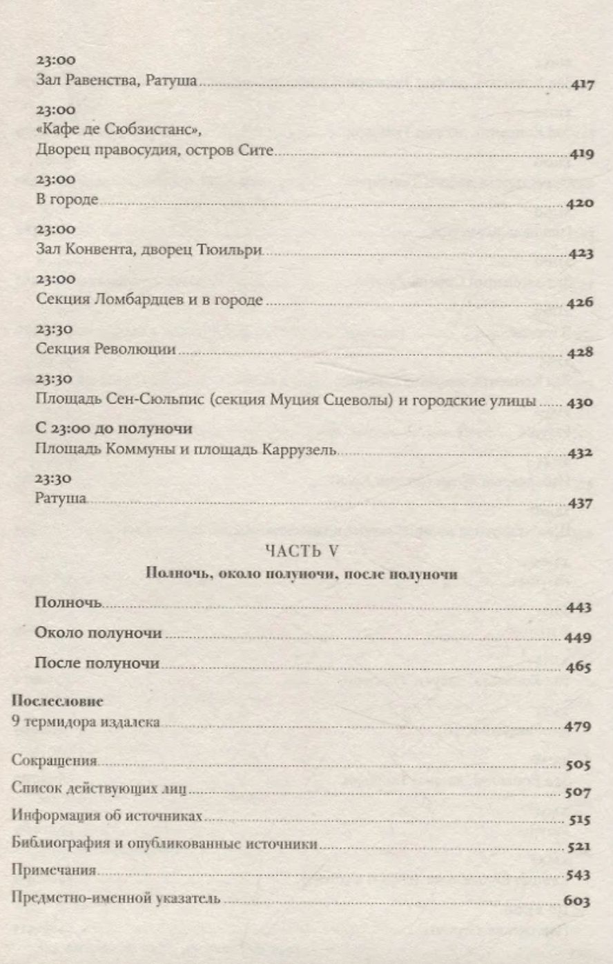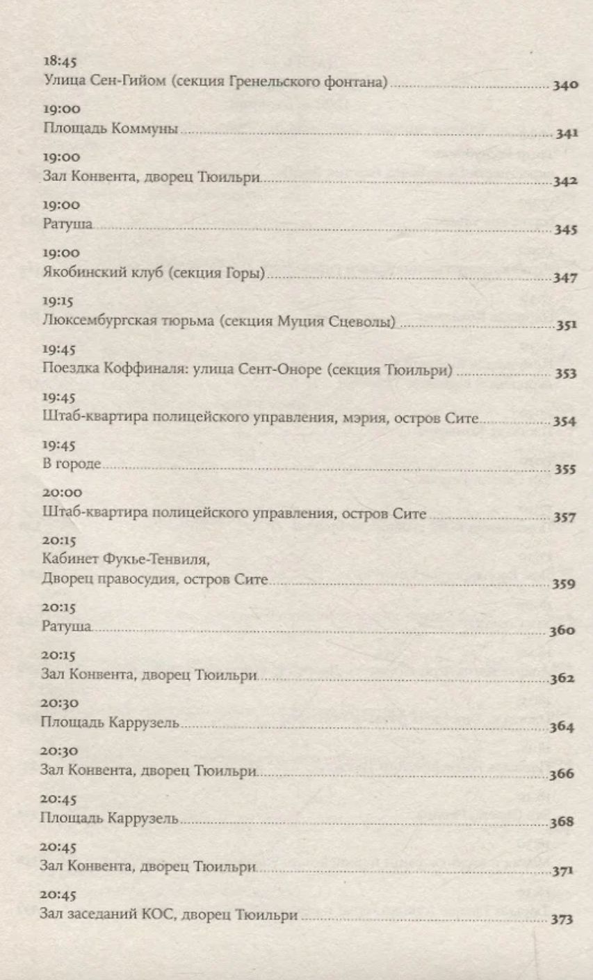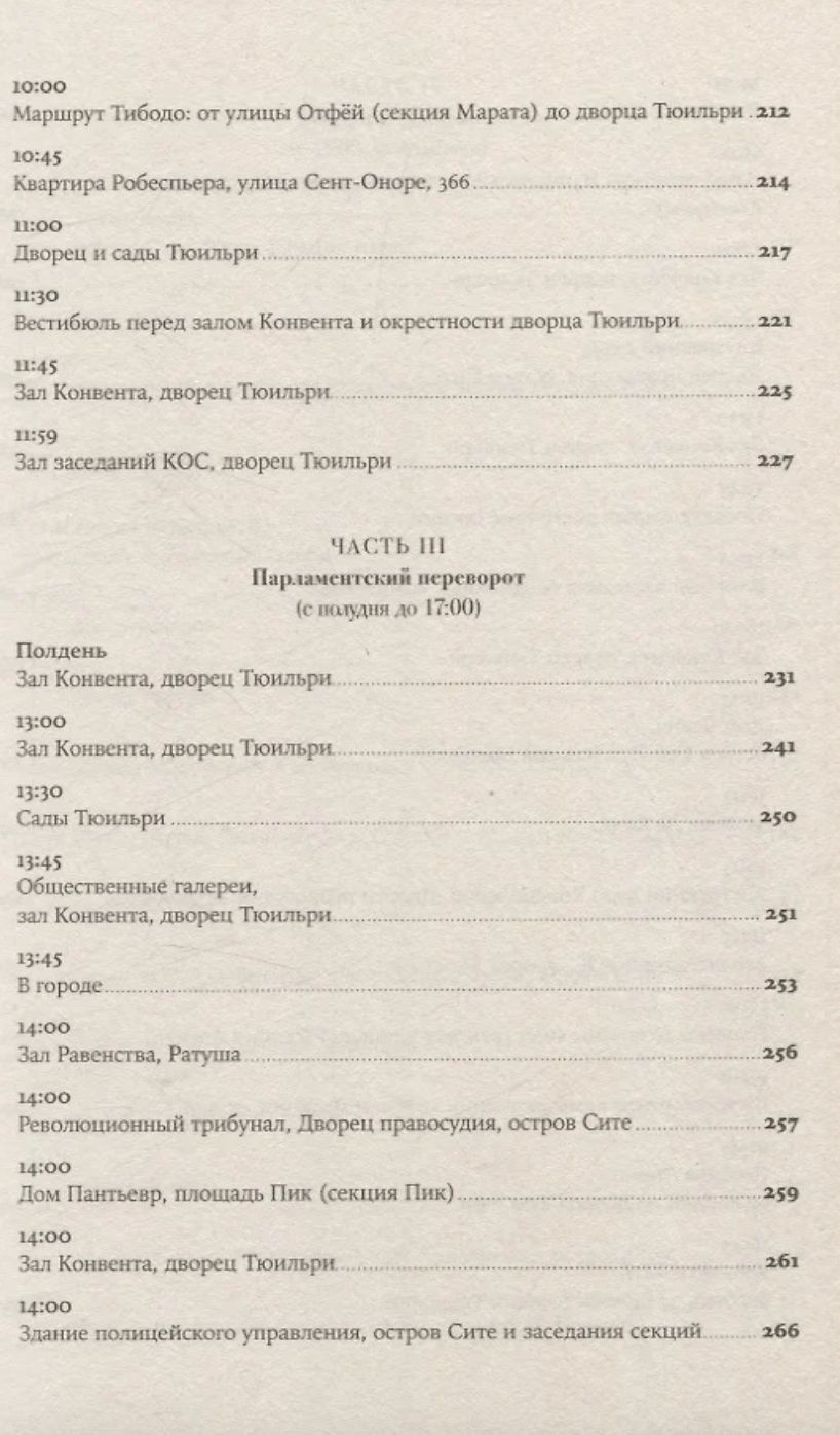 Увлекательная, великолепно выстроенная, исключительно информативная и, наконец, написанная остроумным автором, эта книга — настоящая «машина времени»: перед вами пройдет головокружительно динамичная серия сцен, разворачивающихся в разных местах Парижа и складывающихся в живой репортаж. Лезвие гильотины отсекает головы одну за другой, часовая стрелка бежит, заговоры возникают и лопаются, сотни действующих лиц совершают героические и фарсовые поступки и вынужденно импровизируют — и никто не знает, кому суждено выжить.