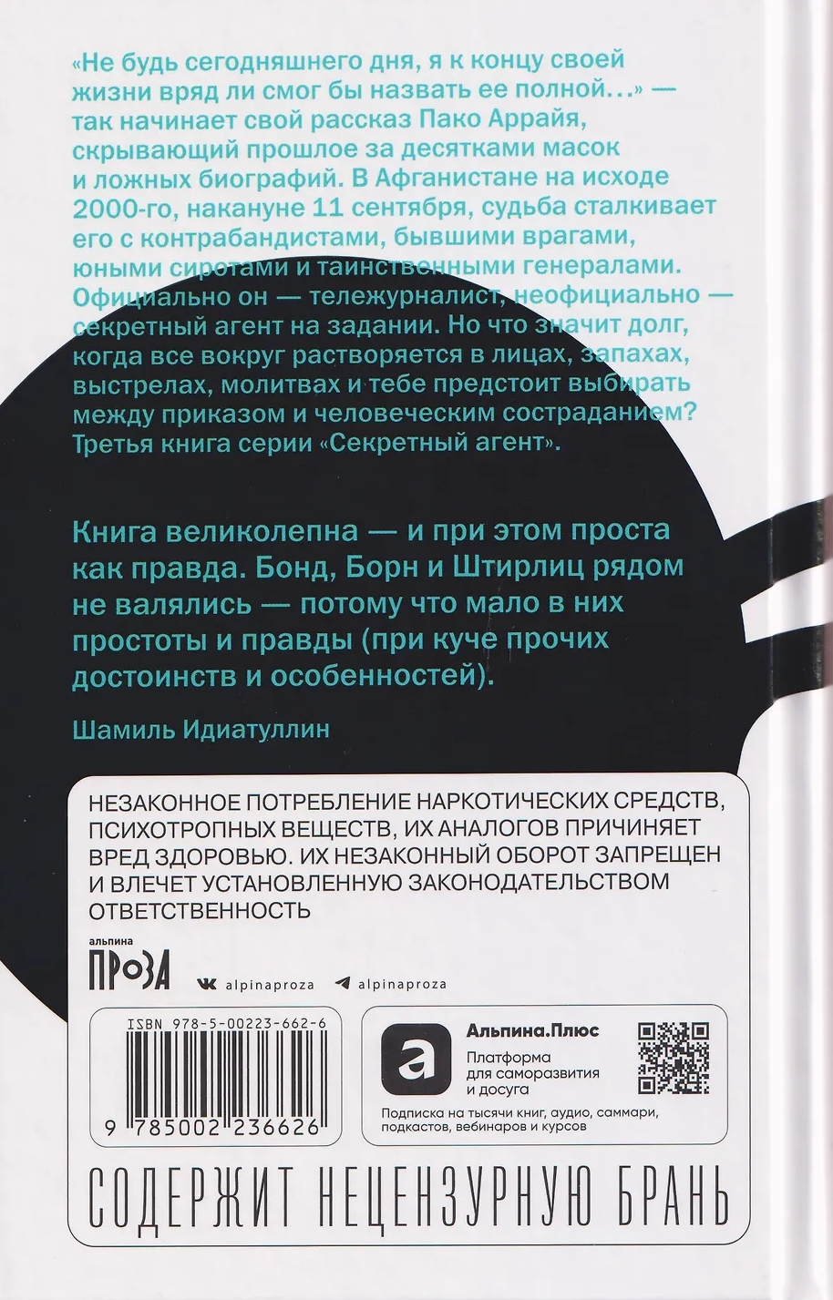 «Не будь сегодняшнего дня, я к концу своей жизни вряд ли смог бы назвать ее полной...» — так начинает свой рассказ Пако Аррайя, скрывающий прошлое за десятками масок и ложных биографий. В Афганистане на исходе 2000-го, накануне 11 сентября, судьба сталкивает его с контрабандистами, бывшими врагами, юными сиротами и таинственными генералами. Официально он — тележурналист, неофициально — секретный агент на задании. Но что значит долг, когда все вокруг растворяется в лицах, запахах, выстрелах, молитвах и тебе предстоит выбирать между приказом и человеческим состраданием?