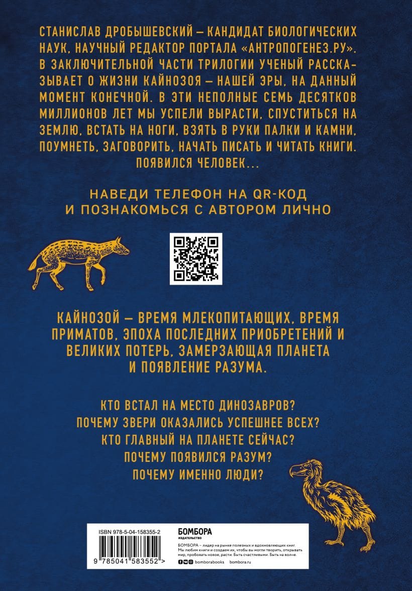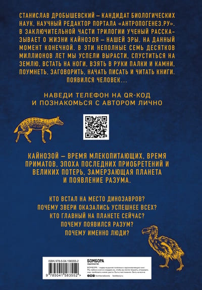 Заключительная часть трилогии «Палеонтология антрополога» известного российского популяризатора науки Станислава Дробышевского расскажет о появлении разума, о том, как за неполные семь десятков миллионов лет мы успели вырасти, спуститься на землю, встать на ноги, взять в руки палки и камни, поумнеть, заговорить, начать писать и читать книги, и как появился Человек...