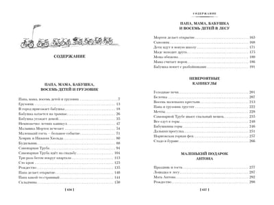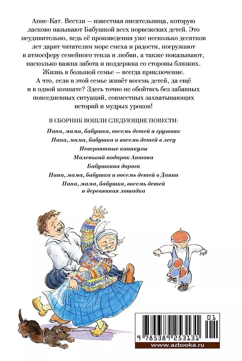 Читайте в этом сборнике следующие повести: Папа, мама, бабушка, восемь детей и грузовик Папа, мама, бабушка и восемь детей в лесу Невероятные каникулы Маленький подарок Антона Бабушкина дорога Папа, мама, бабушка и восемь детей в Дании Папа, мама, бабушка, восемь детей и деревянная лошадка.
