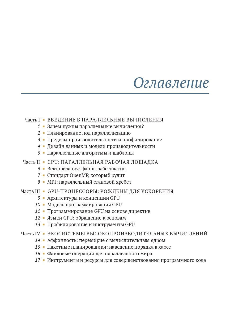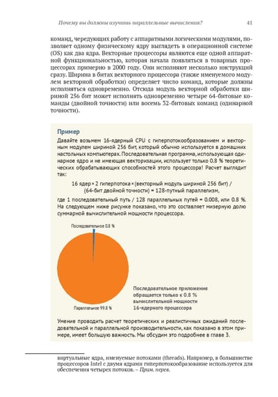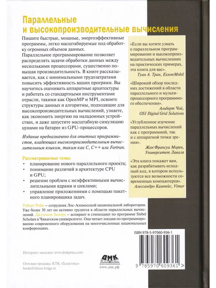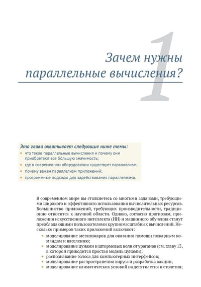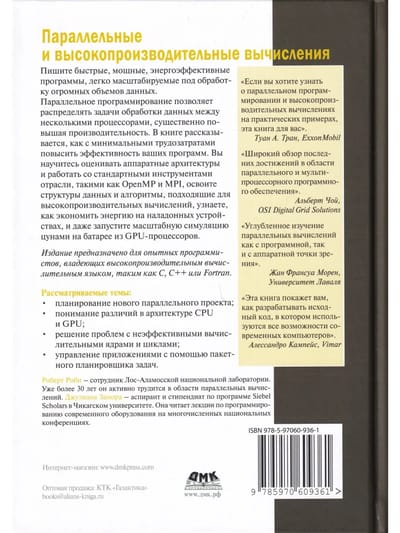 Параллельное программирование позволяет распределять задачи обработки данных между несколькими процессорами, существенно повышая производительность. В книге рассказывается, как с минимальными трудозатратами повысить эффективность ваших программ. Вы научитесь оценивать аппаратные архитектуры и работать со стандартными инструментами отрасли, такими как OpenMP и MPI, освоите структуры данных и алгоритмы, подходящие для высокопроизводительных вычислений, узнаете, как экономить энергию на наладонных устройствах, и даже запустите масштабную симуляцию цунами на батарее из GPU-процессоров. Издание предназначено для опытных программистов, владеющих языком высокопроизводительных вычислений, таким как C, C++ или Fortran.