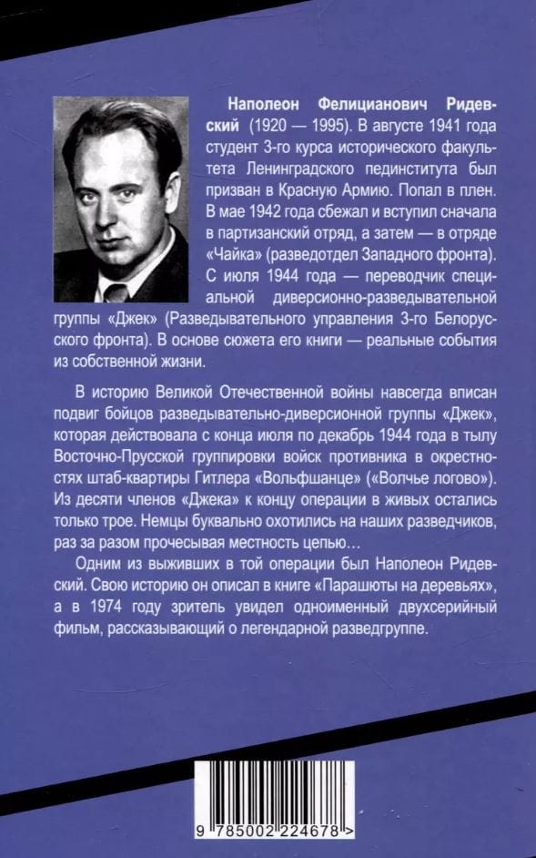 В историю Великой Отечественной войны навсегда вписан подвиг бойцов разведывательно-диверсионной группы «Джек», которая действовала с конца июля по декабрь 1944 года в тылу Восточно-Прусской группировки войск противника в окрестностях штаб-квартиры Гитлера «Вольфшанце» («Волчье логово»). Из десяти членов «Джека» к концу операции в живых остались только трое. Немцы буквально охотились на наших разведчиков, раз за разом прочесывая местность цепью… Одним из выживших в той операции был Наполеон Ридевский. Свою историю он описал в книге «Парашюты на деревьях», а в 1974 году зритель увидел одноименный двухсерийный фильм, рассказывающий о легендарной разведгруппе.