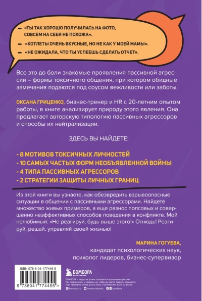 «Ты так хорошо получилась на фото, совсем на себя не похожа». «Котлеты очень вкусные, но не как у моей мамы». «Не ожидала, что ты успеешь сделать отчет». Все это до боли знакомые проявления пассивной агрессии — формы токсичного общения, при котором обидные замечания подаются под соусом вежливости и заботы. Оксана Гриценко, бизнес-тренер и HR с 20-летним опытом работы, в книге анализирует природу этого явления. Она предлагает авторскую типологию пассивных агрессоров и способы их нейтрализации.