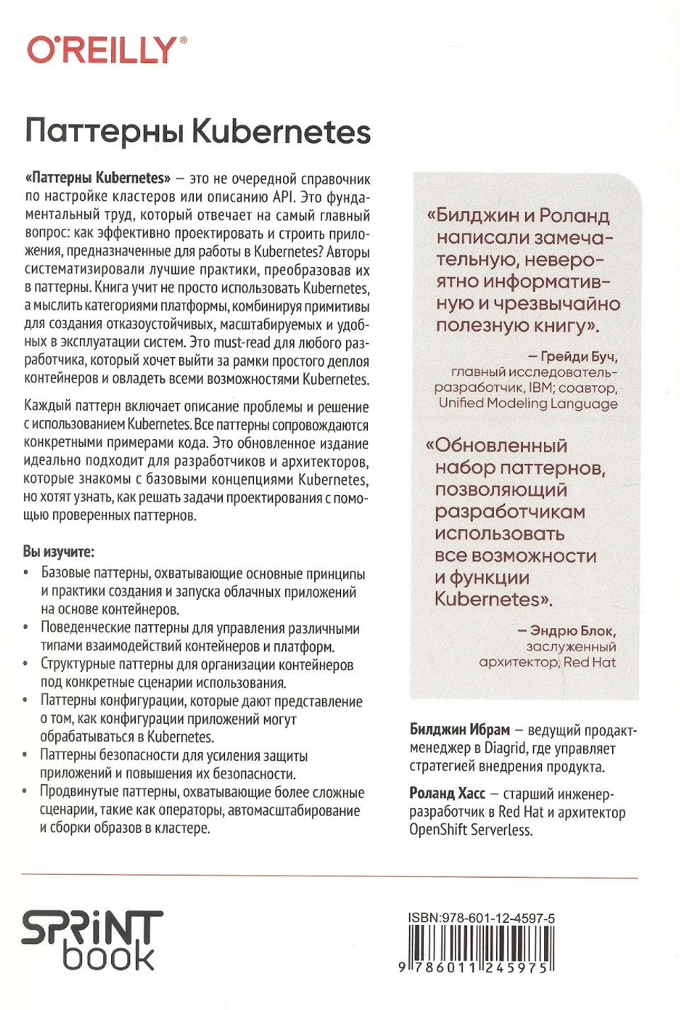 Каждый паттерн включает описание проблемы и решение с использованием Kubernetes. Все паттерны сопровождаются конкретными примерами кода. Это обновленное издание идеально подходит для разработчиков и архитекторов, которые знакомы с базовыми концепциями Kubernetes, но хотят узнать, как решать задачи проектирования с помощью проверенных паттернов.