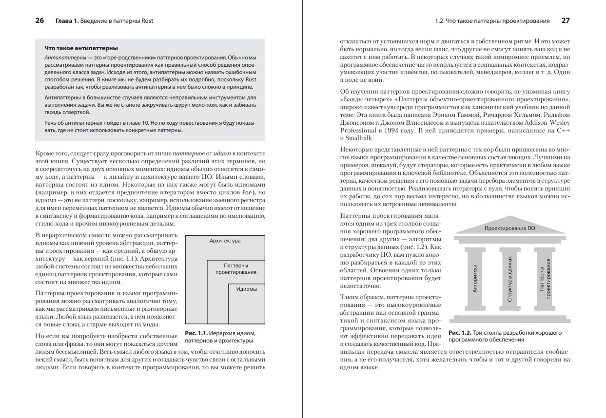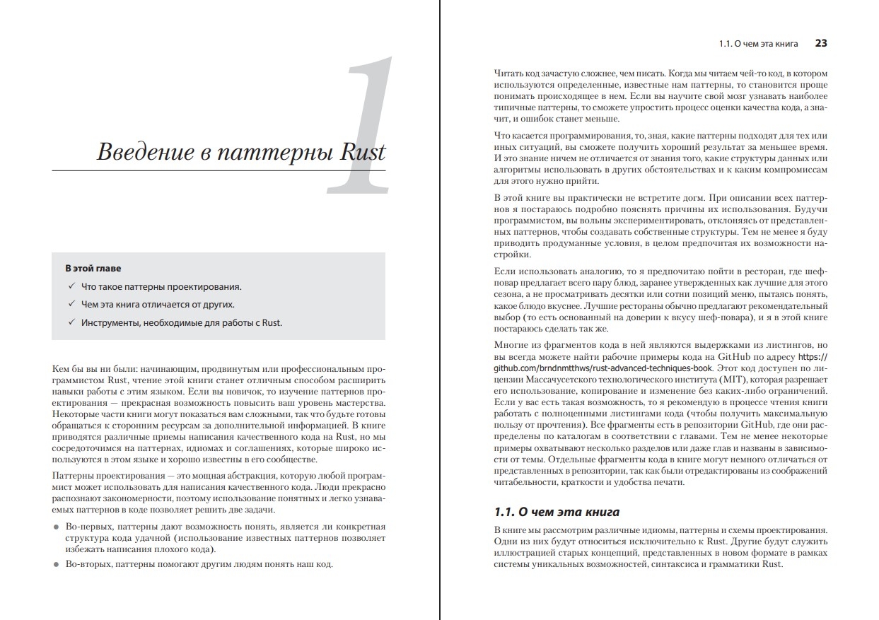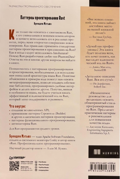 Как только вы освоитесь с синтаксисом Rust, с его уникальным и мощным компилятором и начнете использовать его в реальных проектах, перед вами откроется совершенно новое измерение. Как правильно применять стандартные паттерны проектирования в приложениях на Rust? Как и когда следует использовать IntoIterator? Почему Rust-разработчики любят тип PhantomData? Ответы на эти и многие другие вопросы вы найдете в книге.