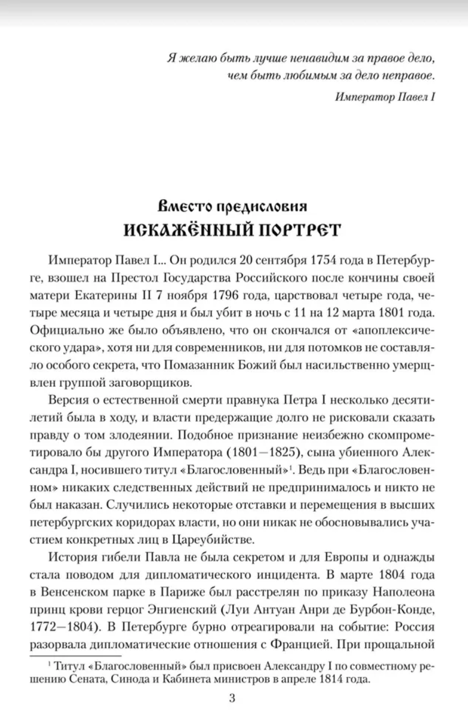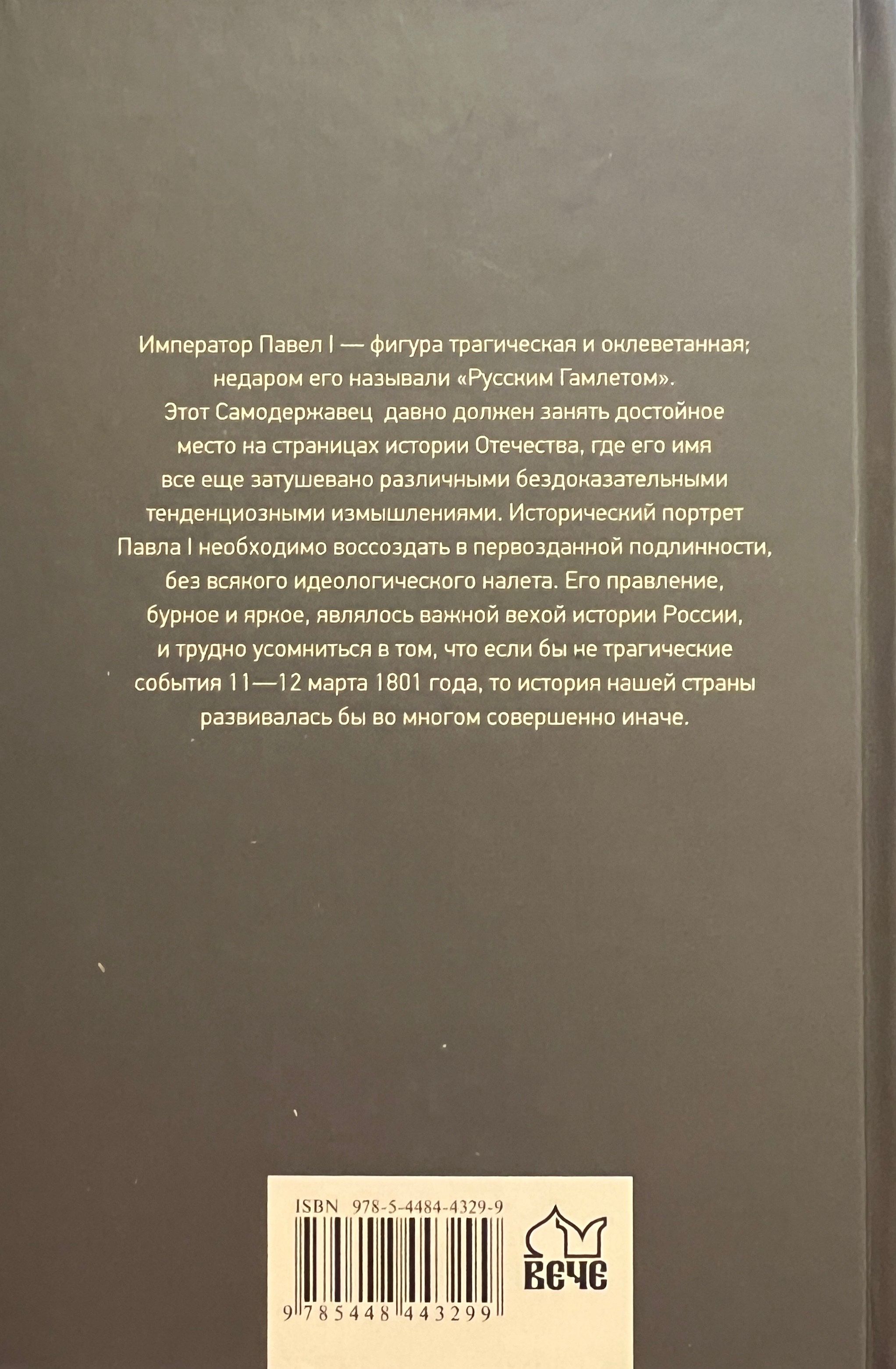 Император Павел I — фигура трагическая и оклеветанная; недаром его называли «Русским Гамлетом». Этот Самодержец давно должен занять достойное место на страницах истории Отечества, где его имя все еще затушевано различными бездоказательными тенденциозными измышлениями. Исторический портрет Павла I необходимо воссоздать в первозданной подлинности, без всякого идеологического налета. Его правление, бурное и яркое, являлось важной вехой истории России, и трудно усомниться в том, что если бы не трагические события 11—12 марта 1801 года, то история нашей страны развивалась бы во многом совершенно иначе.