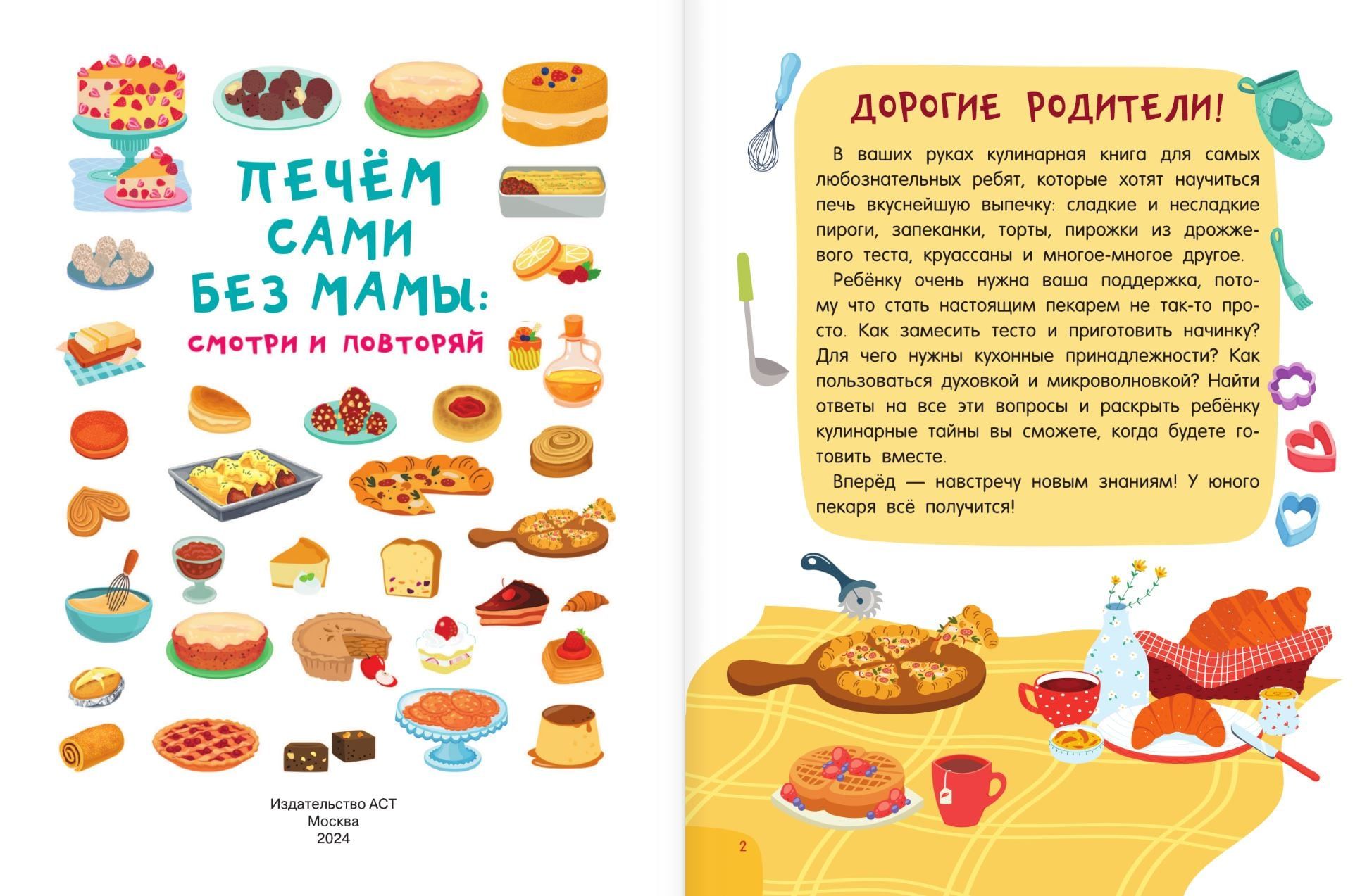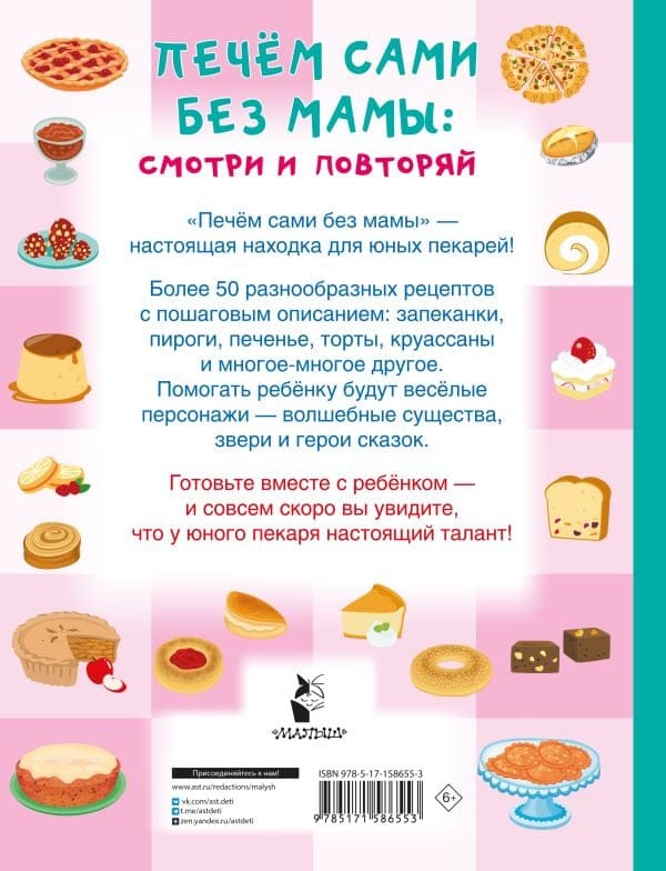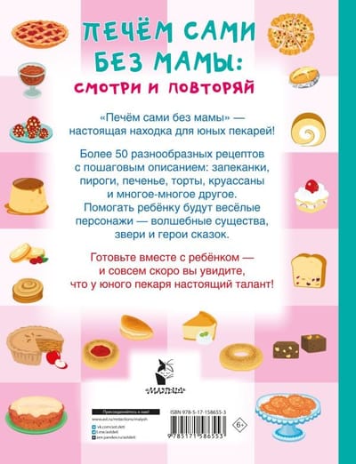 «Печём сами без мамы» — настоящая находка для юных пекарей и их родителей. Под обложкой более 60 разнообразных рецептов с пошаговым описанием: запеканки, пироги, печенье, торты, круассаны и многое-многое другое. Помогать ребёнку будут весёлые персонажи — звери, волшебные существа и герои сказок. Яркие иллюстрации, выполненные в стиле современных мультфильмов.
