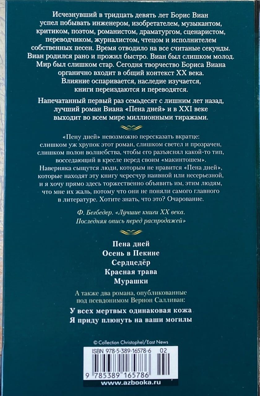 Борис Виан писал прозу и стихи, работал журналистом, писал сценарии и снимался в кино, пел и сочинял песни. Редкий случай, когда интеллектуальная проза оказывается еще и смешной, но именно таково главное произведение Бориса Виана «Пена дней». Увлекательный, фантасмагорический, феерический роман-загадка и сегодня печатается во всем мире миллионными тиражами.