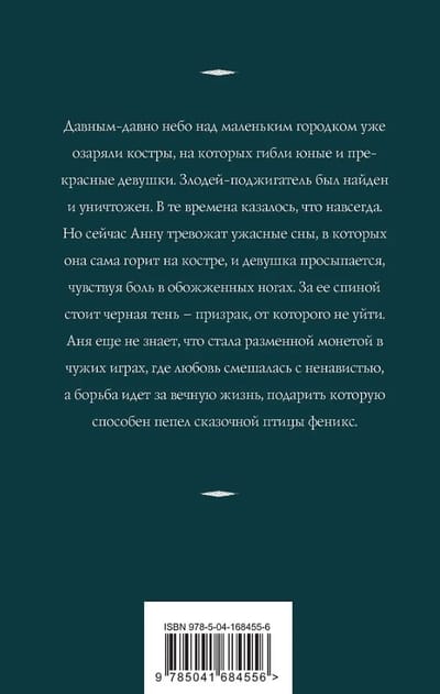 Давным-давно небо над маленьким городком уже озаряли костры, на которых гибли юные и прекрасные девушки. Злодей-поджигатель был найден и уничтожен. В те времена казалось, что навсегда. Но сейчас Анну тревожат ужасные сны, в которых она сама горит на костре, и девушка просыпается, чувствуя боль в обожженных ногах. За ее спиной стоит черная тень — призрак, от которого не уйти. Аня еще не знает, что стала разменной монетой в чужих играх, где любовь смешалась с ненавистью, а борьба идет за вечную жизнь, подарить которую способен пепел сказочной птицы феникса.