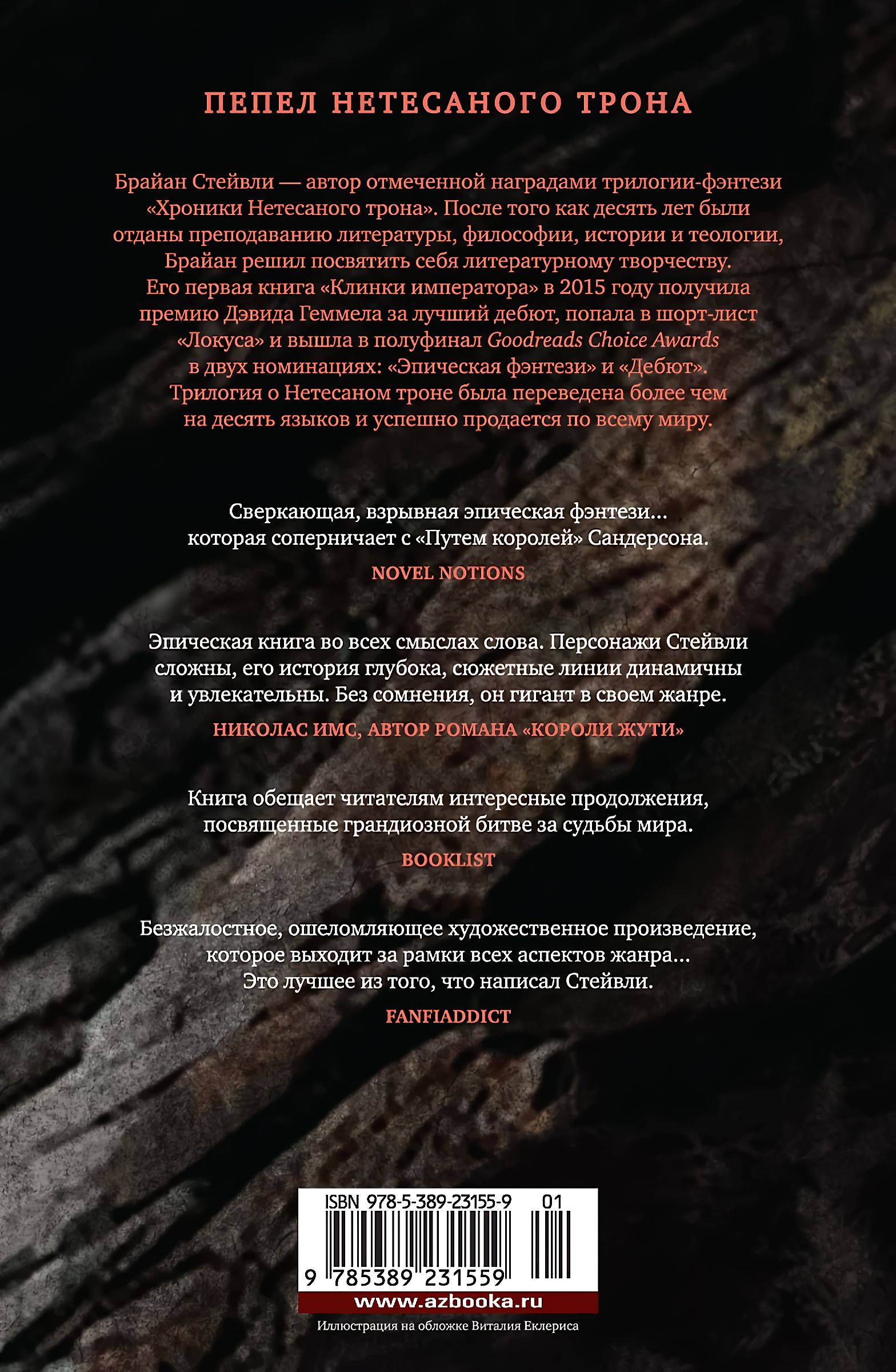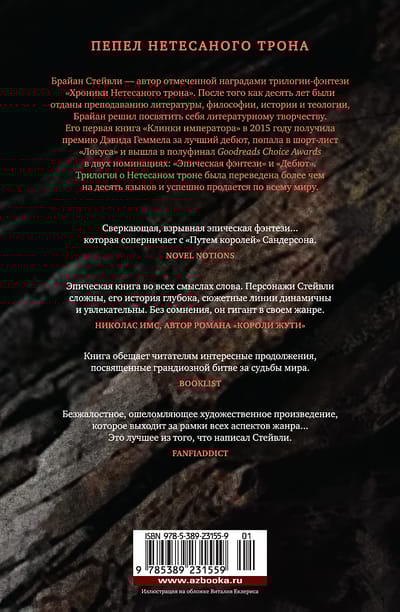 Прошло пять лет после загадочных событий, описанных в «Хрониках Нетесаного трона». Все говорит о том, что Аннурская империя близится к закату. Опустошительная война и гражданские беспорядки ослабили державную власть. Почти полностью уничтожено элитное воинское подразделение, летавшее на гигантских ястребах, — гордость и слава империи. Закрылись врата, с помощью которых потомки династии Малкенианов могли мгновенно перемещаться в любую точку мира. Император, желая восстановить численность крылатого воинства, посылает экспедицию на поиски легендарного гнездовья боевых ястребов. Опасный путь ведет через земли, где все живое гибнет или подвергается страшным изменениям. Шансов уцелеть в этом походе крайне мало, как и времени на то, чтобы вернуть державе былую мощь, но действовать надо быстро, ведь на окраине империи пробудился древний могущественный враг... И тут в Рассветный дворец является монах, требующий высочайшей аудиенции. Он уверяет, что ему известен ключ к чудесным вратам. Однако этот хитрый человек слишком дорого продает свое тайное знание... «На руинах империи» — первая книга новой трилогии-фэнтези Брайана Стейвли «Пепел Нетесаного трона».