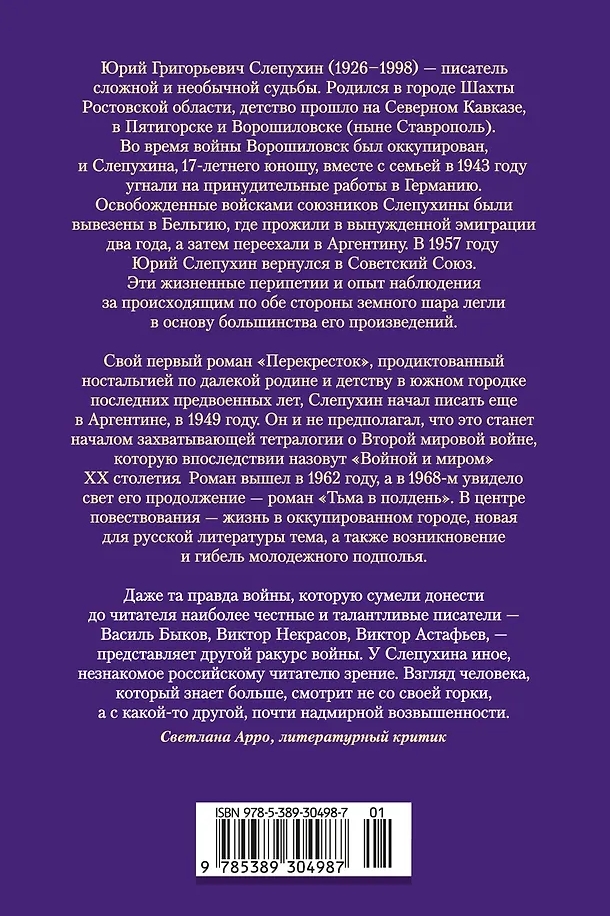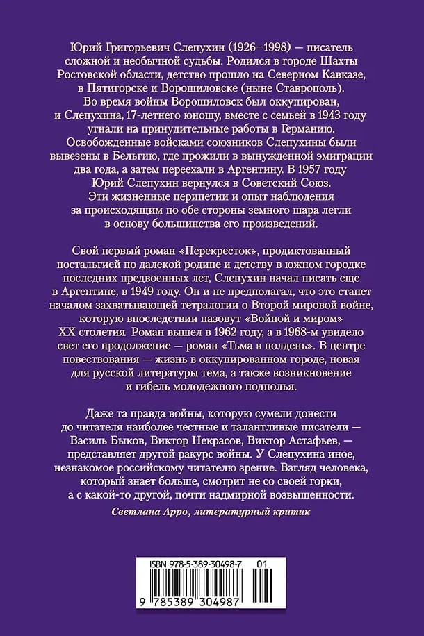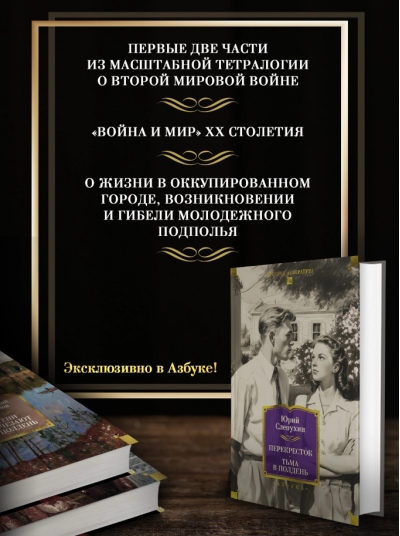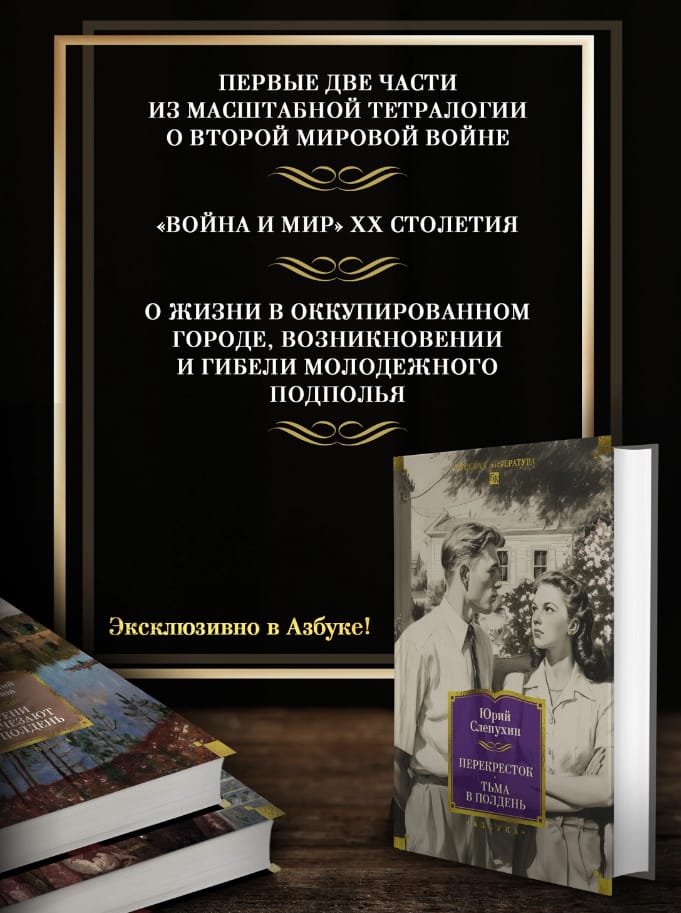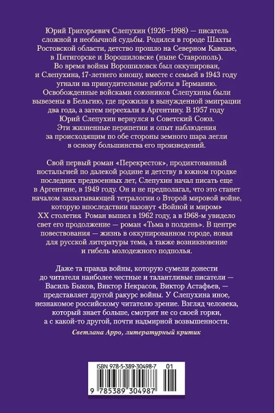Свой первый роман «Перекресток», продиктованный ностальгией по далекой родине и детству в южном городке последних предвоенных лет, Слепухин начал писать еще в Аргентине, в 1949 году. Он и не предполагал, что это станет началом захватывающей тетралогии о Второй мировой войне, которую впоследствии назовут «Войной и миром» XX столетия. Роман вышел в 1962 году, а в 1968-м увидело свет его продолжение — роман «Тьма в полдень». В центре повествования — жизнь в оккупированном городе, новая для русской литературы тема, а также возникновение и гибель молодежного подполья.