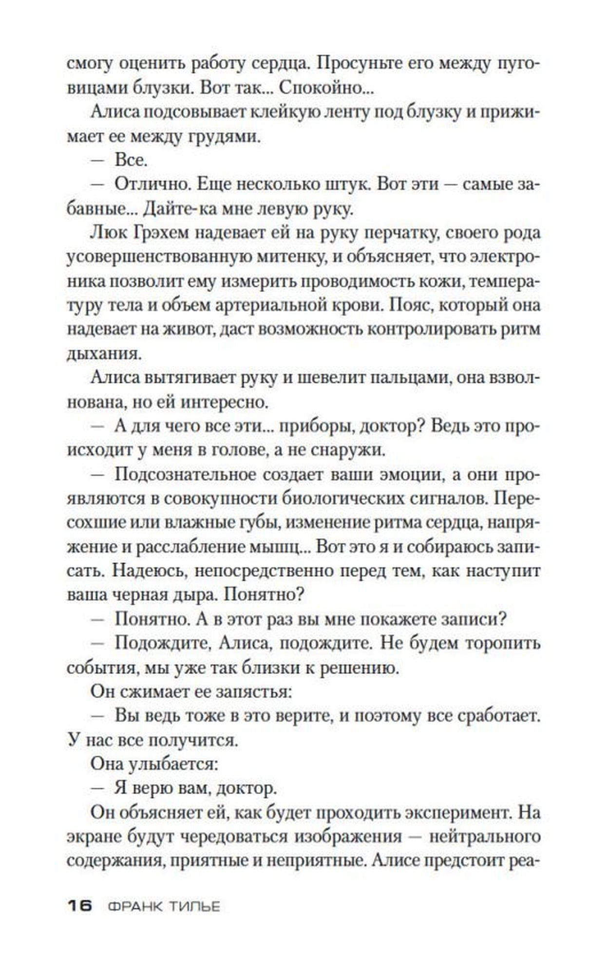 Алиса сознает, что с ней что-то не в порядке, в памяти то и дело возникают черные дыры. Лечение у психиатра Люка Грэхема, казалось бы, должно привести к выздоровлению. Однако вокруг молодой женщины множатся странные события. Например, как объяснить, что фотография ее сестры-близнеца, умершей десять лет назад, попадала в руки беженца, скрывающегося от властей. Как понять, почему ее собственный отец нападал на нее, а теперь утверждает, что пытался покончить с собой; откуда в ванной взялась окровавленная блузка; и наконец, причем тут совершенно неподвижный голый человек, найденный на автобусной остановке? Неужто это погружение в безумие?..