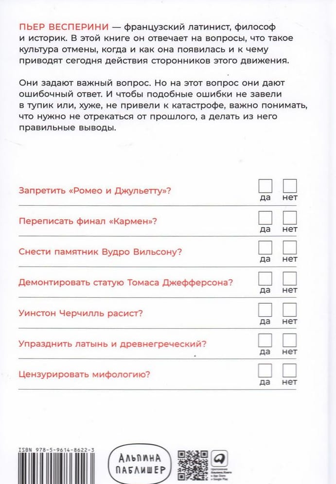 В своей книге французский философ и историк Пьер Весперини показывает, как люди, стремящиеся переписать или стереть неоднозначные моменты прошлого, мешают нам воспринимать уроки истории. Те, кто хочет «отменить» Шекспира, Вудро Вильсона или Черчилля, утверждает Весперини, задают важные вопросы, но не терпят полутонов и зачастую приходят к ошибочным выводам. Его книга поможет читателям лучше понять природу современной социальной дискуссии и сохранить способность критически осмысливать историю, а значит — осознанно формировать будущее.