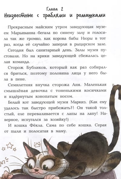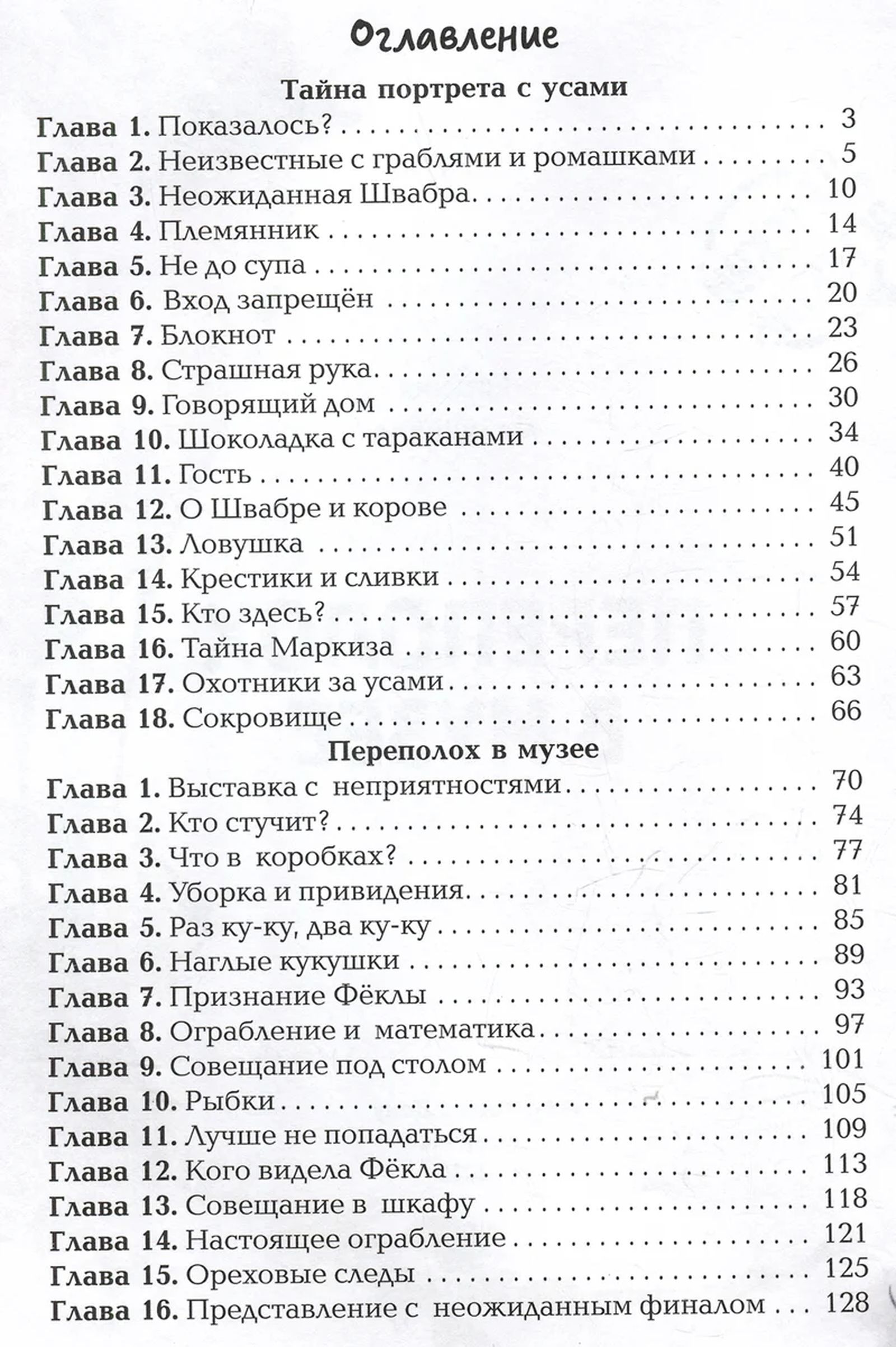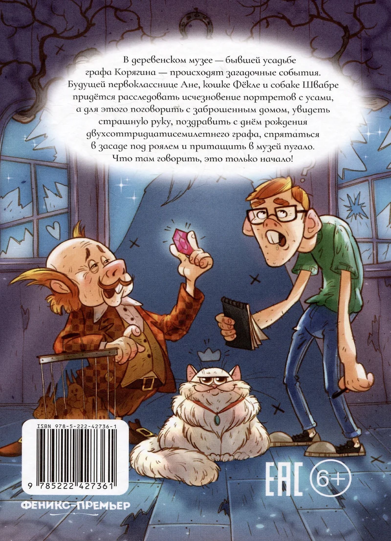 В деревенском музее - бывшей усадьбе графа Корягина - происходят загадочные события. Будущей первокласснице Ане, кошке Фёкле и собаке Швабре придётся расследовать исчезновение портретов с усами, а для этого поговорить с заброшенным домом, увидеть страшную руку, поздравить с днём рождения двухсоттридцатисемилетнего графа, спрятаться в засаде под роялем и притащить в музей пугало. Что там говорить, это только начало! Когда живёшь в старинной усадьбе, битком набитой предметами искусства, жди неприятностей. Уже осенью в музей привозят новую выставку, вместе с которой там поселяются таинственные существа и начинают пропадать вещи. Ане нужно успевать ходить в школу, готовиться к проверочной по математике и охотиться за самыми настоящими преступниками.