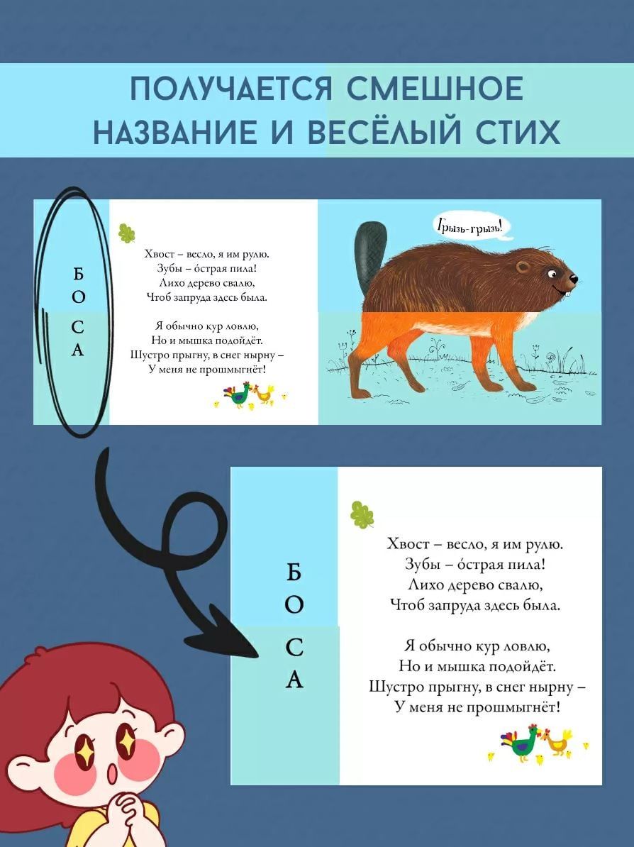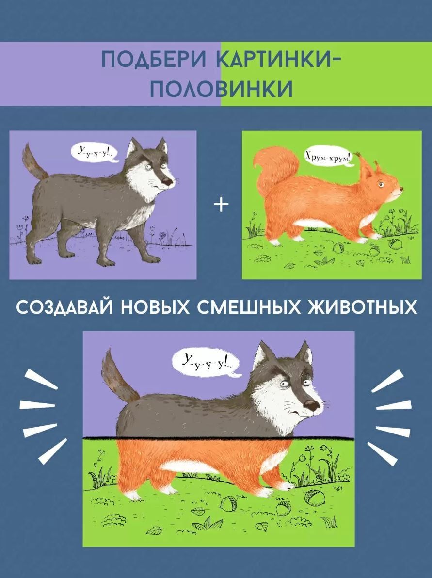 Благодаря конструкции книги, из двух половинок картинки можно сложить 144 животных, а слева при этом сложится его забавное название и описание в стихах.