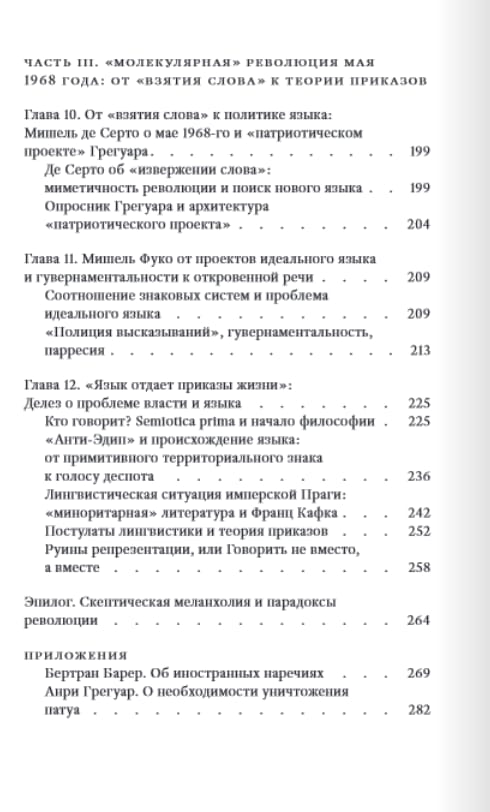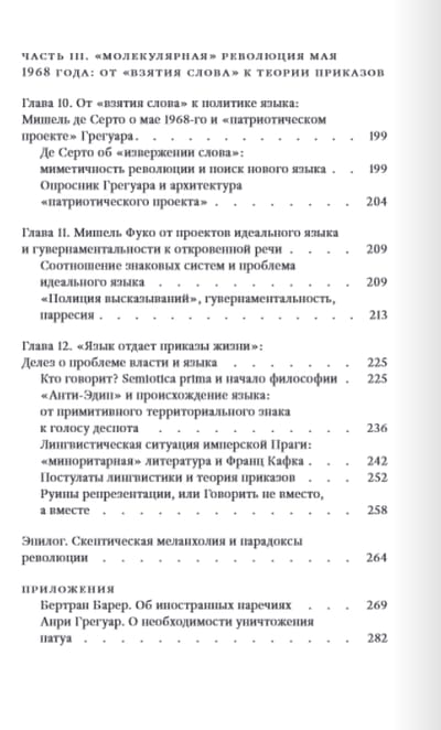 Монография представляет собой новаторскую работу в области политической философии языка. Артикулируя неоднозначную связь между языком и политикой, автор обращается к историческому материалу. Сравнительный анализ языковых политик трех революций — французской, русской и снова французской (события мая 1968 г.) — переплетается с изложением ключевых философских концепций XX века, в частности близкой автору концепции мажоритарных и миноритарных языков Ж. Делеза и Ф. Гваттари, которая используется для анализа языкового строительства в переломные моменты истории. Рассматриваемые в работе феномены представлены с самых разных сторон — в политических, эстетических, языковых и культурных аспектах. При этом сама постановка вопроса оригинальна и нова: язык, власть, народ, национальный вопрос рассматриваются здесь с позиций современной философской теории.