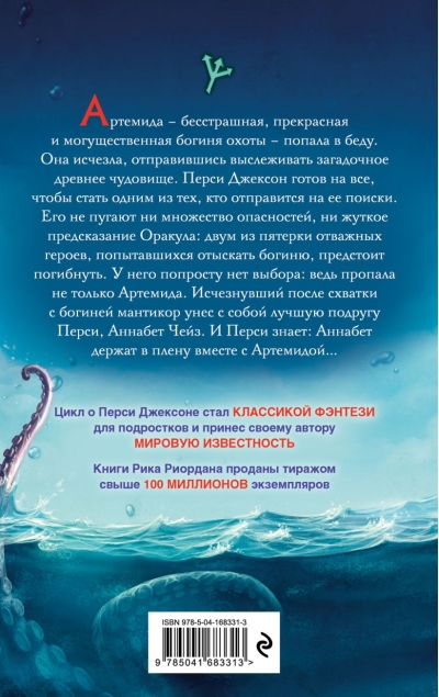 Конечно, Перси не стоило так рисковать. Но он рискнул — и попытался один на один одолеть могущественное чудовище, мантикора. Сын Посейдона наверняка бы погиб, если бы на помощь ему не пришли друзья и сама богиня Артемида. Но это еще не самое страшное! Отступая, мантиктор унес с собой Аннабет Чейз. А отправившаяся по его следам Артемида сама попала в беду... Теперь Перси готов на все, чтобы найти и освободить Аннабет! И, конечно, помочь Артемиде. В Лагере полукровок организуют спасательную экспедицию, только легким этот поиск не будет. Оракул предсказал, что его участники столкнуться с невиданными опасностями. И что двое из них погибнут. Но Перси это пророчество не остановит…