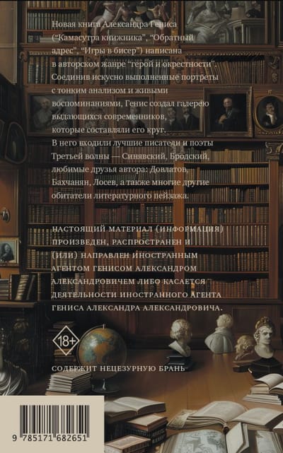 Новая книга Александра Гениса («‎Камасутра книжника»‎, «‎Обратный адрес»‎, «‎Игры в бисер»‎) написана в авторском жанре «‎герой и окрестности»‎. Соединив искусно выполненные портреты с тонким анализом и живыми воспоминаниями, Генис создал галерею выдающихся современников, которые составляли его круг. В него входили лучшие писатели и поэты Третьей волны — Синявский, Бродский, любимые друзья автора: Довлатов, Бахчанян, Лосев, а также многие другие обитатели литературного пейзажа.