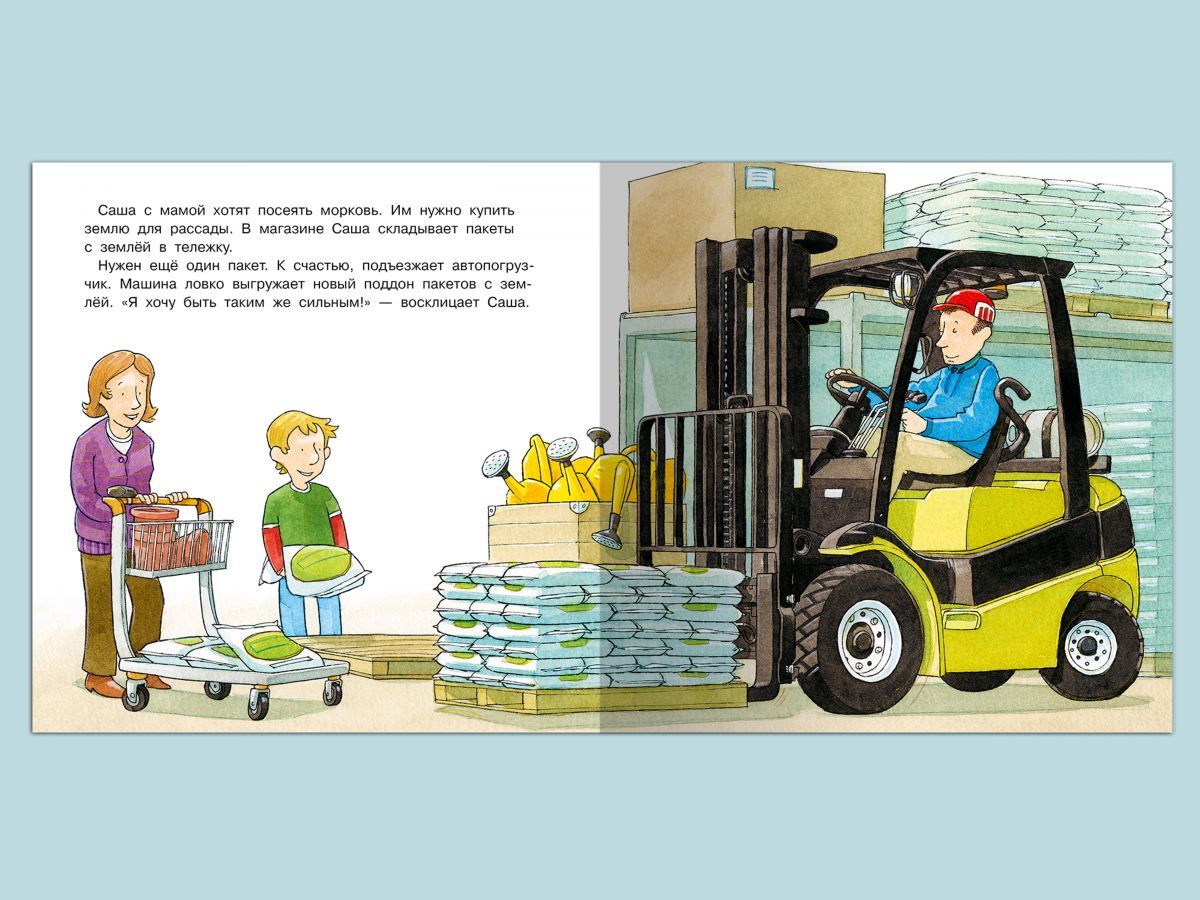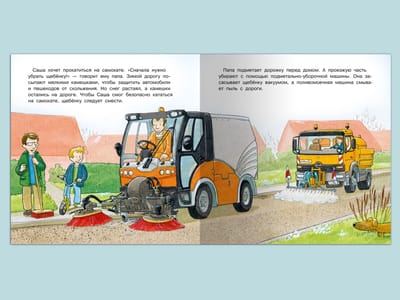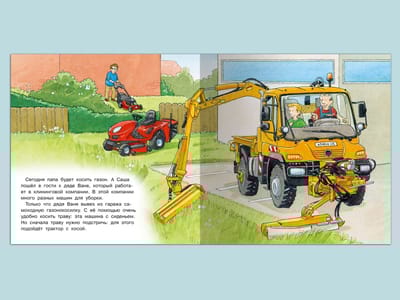 На каждом развороте внимание малыша привлекут тщательно прорисованные красочные изображения самых разных машин, помогающих человеку в повседневной жизни. Это мусоро- и снегоуборочные машины, различные виды погрузчиков и сельскохозяйственной техники, машины-автовышки и грузовики с грейферным краном, ледовые комбайны и машины для мытья пола в метро.