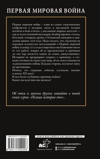 Первая мировая война – один из самых смертоносных конфликтов в истории: около 9 миллионов человек погибли в боях и более 5 миллионов мирных жителей— в результате военной оккупации, бомбардировок, голода и болезней. Миллионы людей погибли в результате геноцида армян в Османской империи и пандемии гриппа 1918 года. Надо сказать, что, несмотря на огромное количество исследований (к концу 2012 года в мире было опубликовано около 60 000 работ о Первой мировой войне), вопрос о предпосылках и причинах этой войны до сих пор является одним из самых дискуссионных. Историки не прекращают спорить о причинах войны, о степени готовности к ней стран-участниц, об ответственности за развязывание конфликта. Каждая сторона, возлагает вину на противника. Почему это страшное событие случилось именно в начале ХХ века? В чем были глубинные причины начала конфликта? Какие последствия он вызвал? Об этом и многом другом читайте в новой книге серии «Полная история эпох».